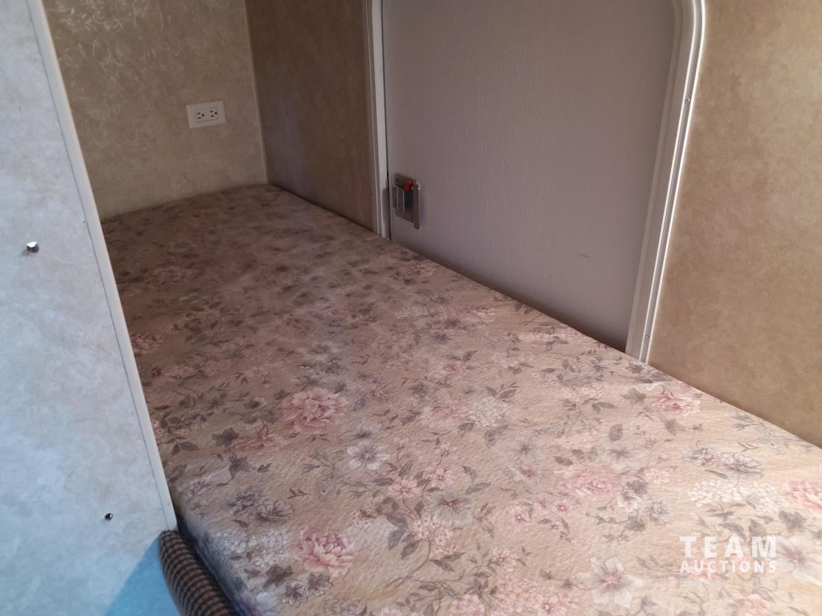 Queen bed, bunk bed, table folds down, couch, fridge, microwave, stove, bathroom, tire size ST235/80R16