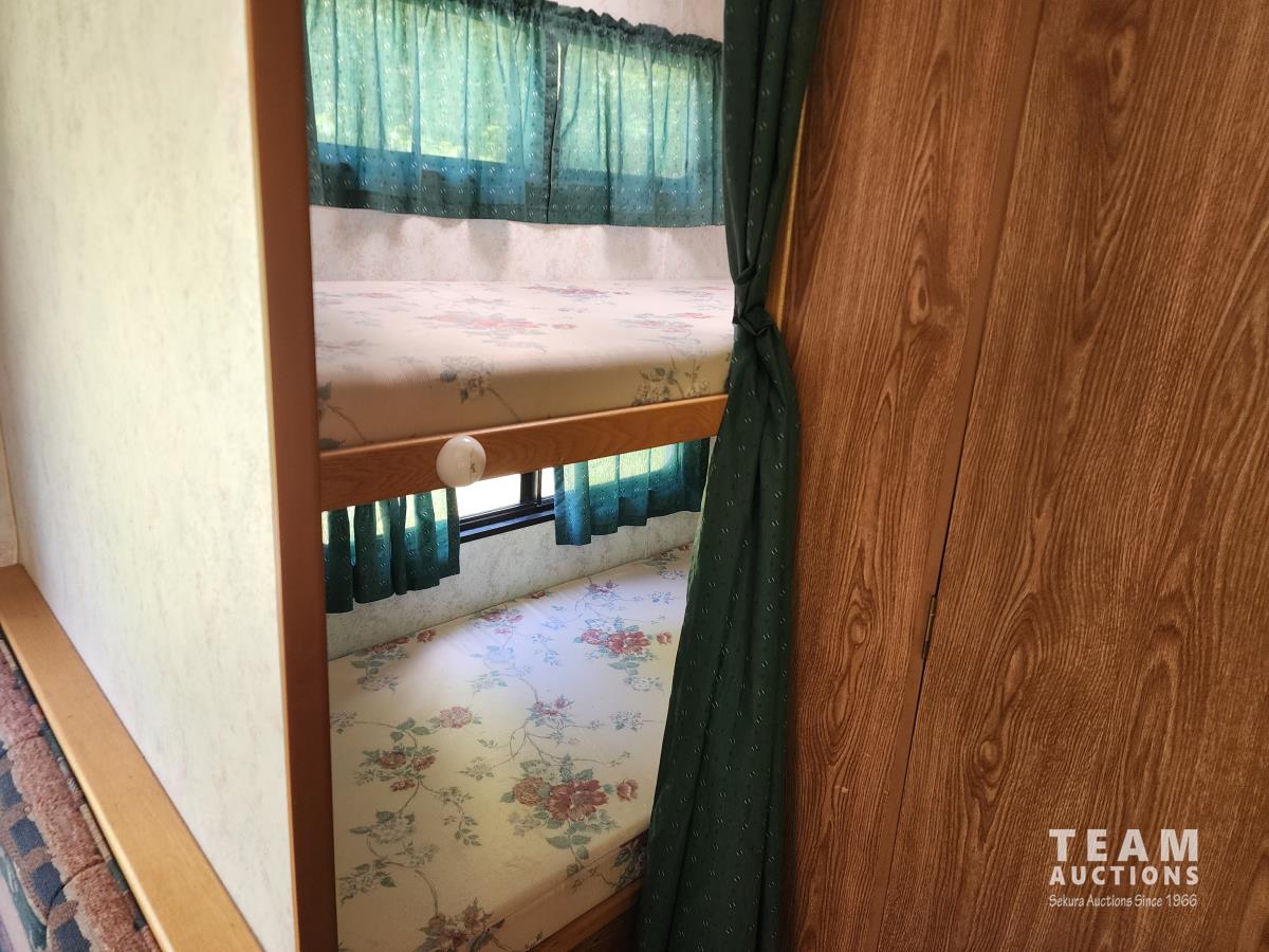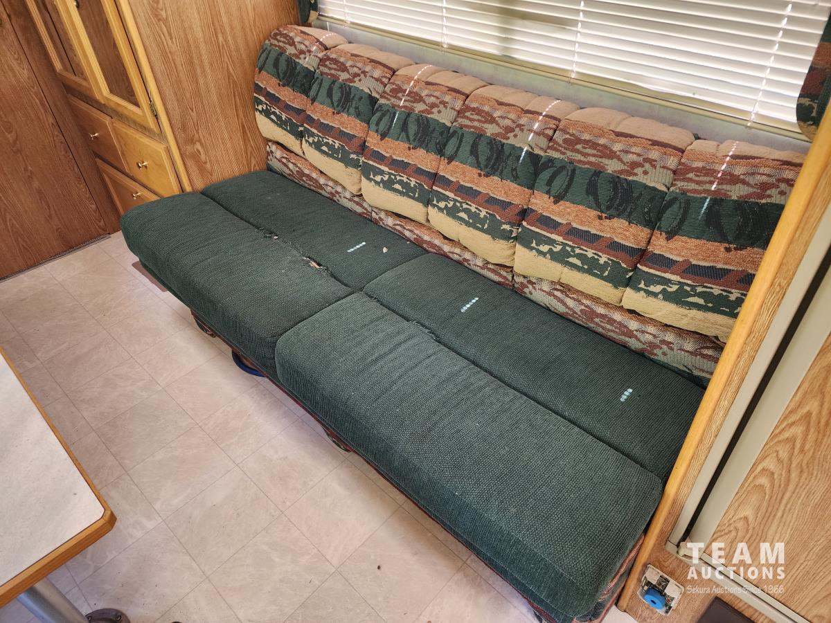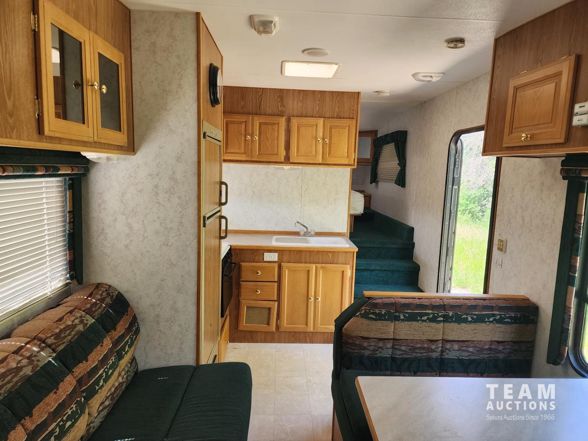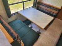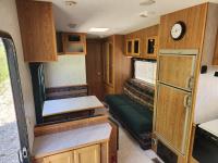Fridge, stove, dinette, pull out couch, rear bunks, bathroom, front queen bed, outdoor shower, spare tire, 205/75D15 tires