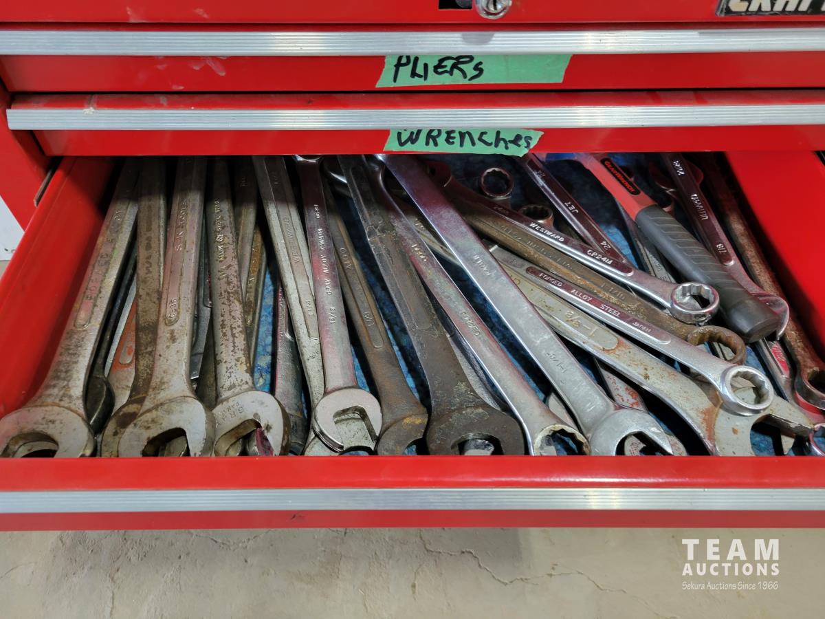 29" w x 17 1/4" d x 32 1/2" h tool box, pliers, wrenches and vise grips