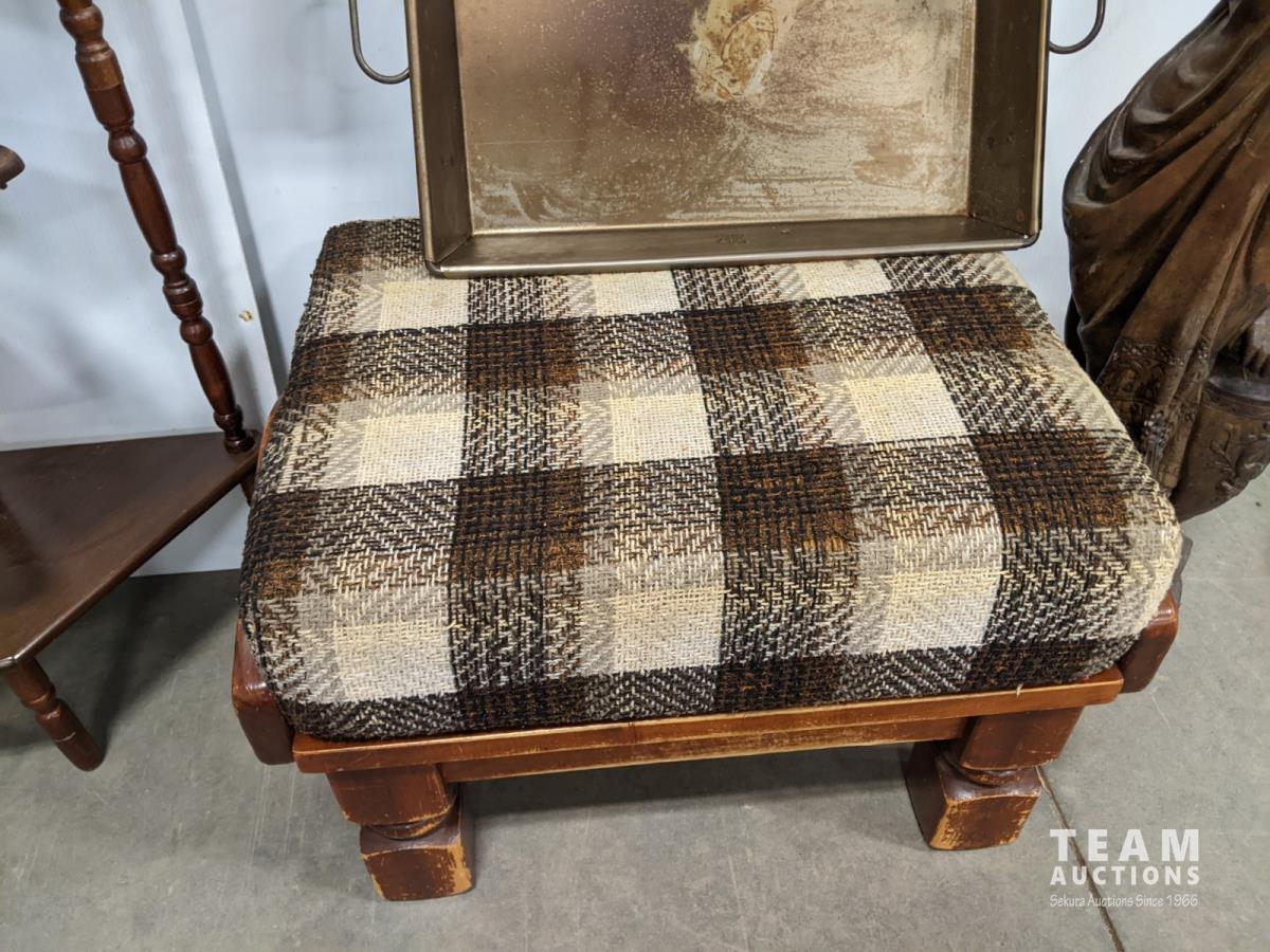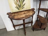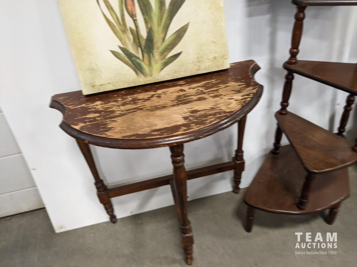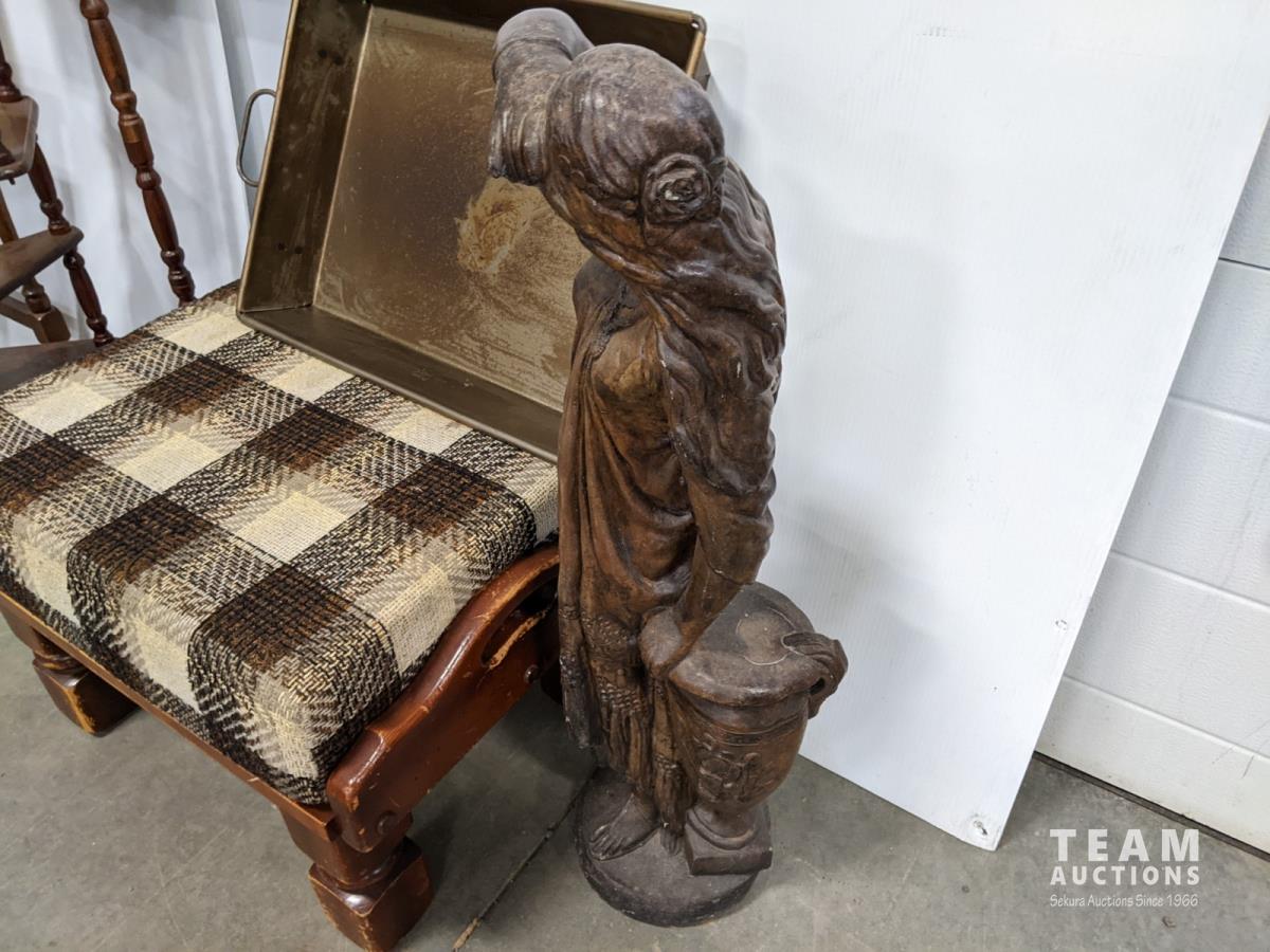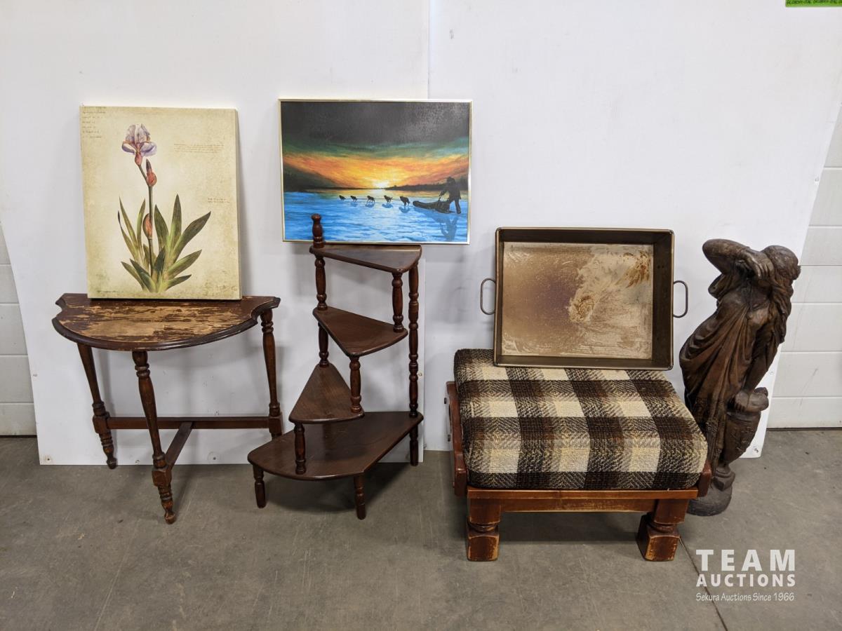 1144 Hallway Table, Side Table, (2) Pictures, Foot Stool, Large Pan and Yard Statue