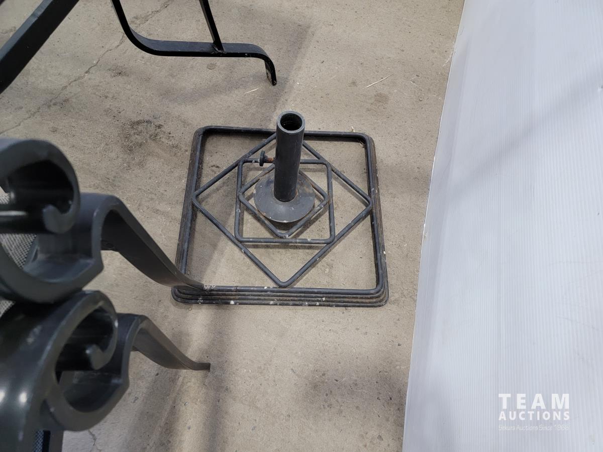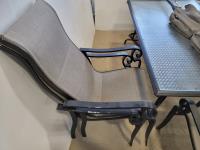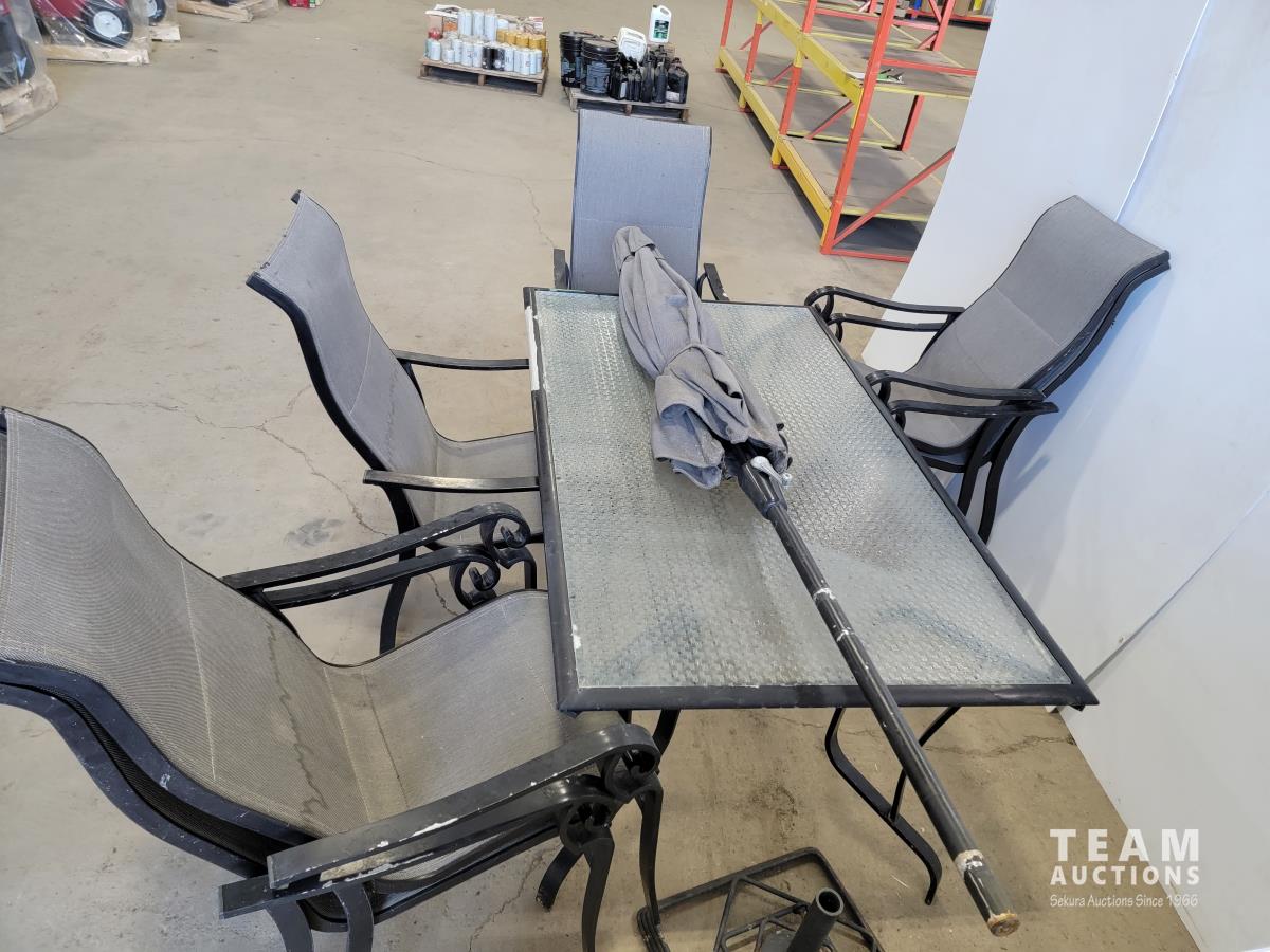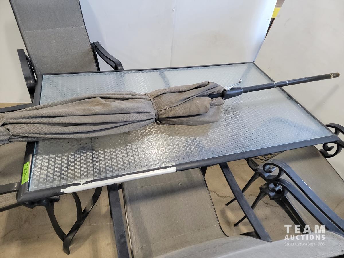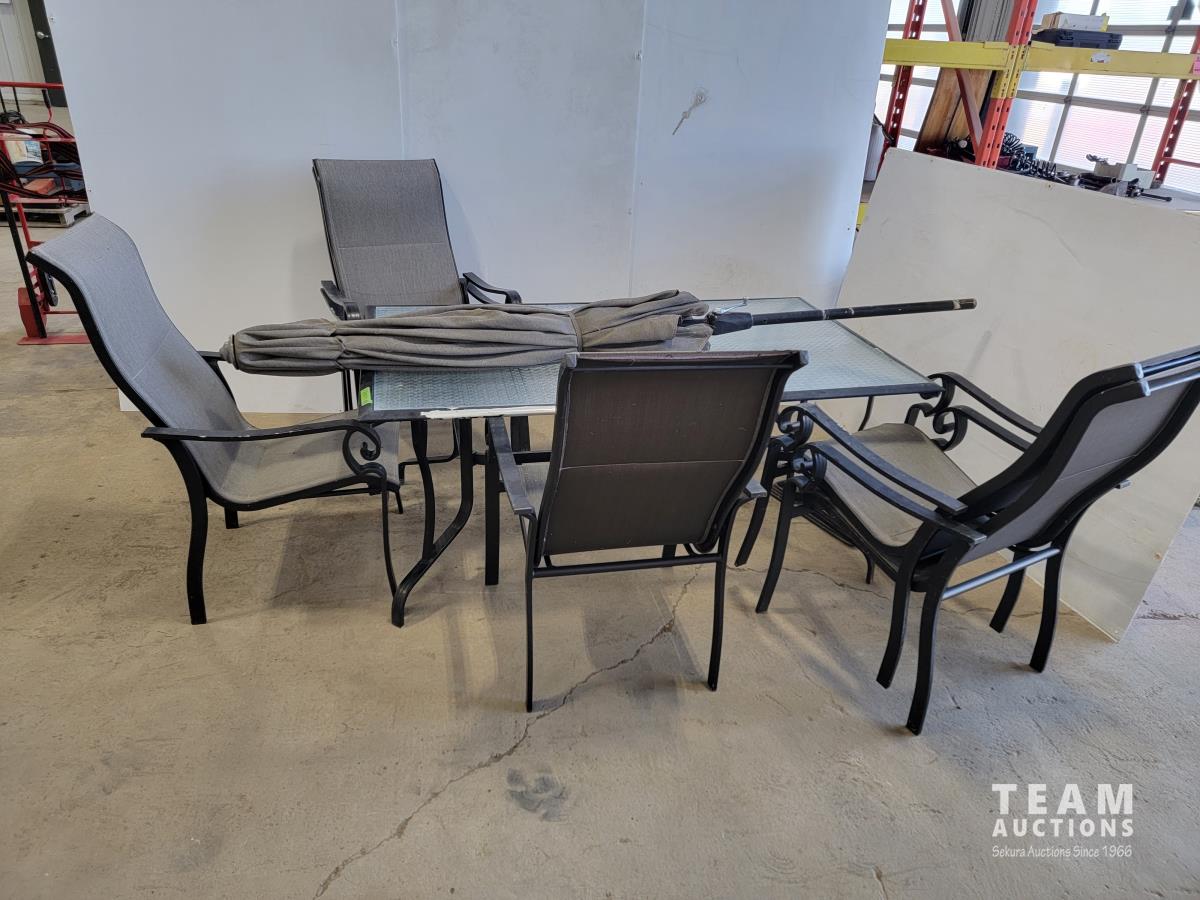 Table 66 inch l x 38 inch d x 27.5 inch h, (6) chairs and umbrella