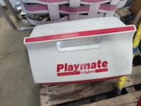 (3) coolers, water jug, assorted Thermos jugs, lawn chairs, horse shoe game with score board, Coleman camp stove
