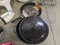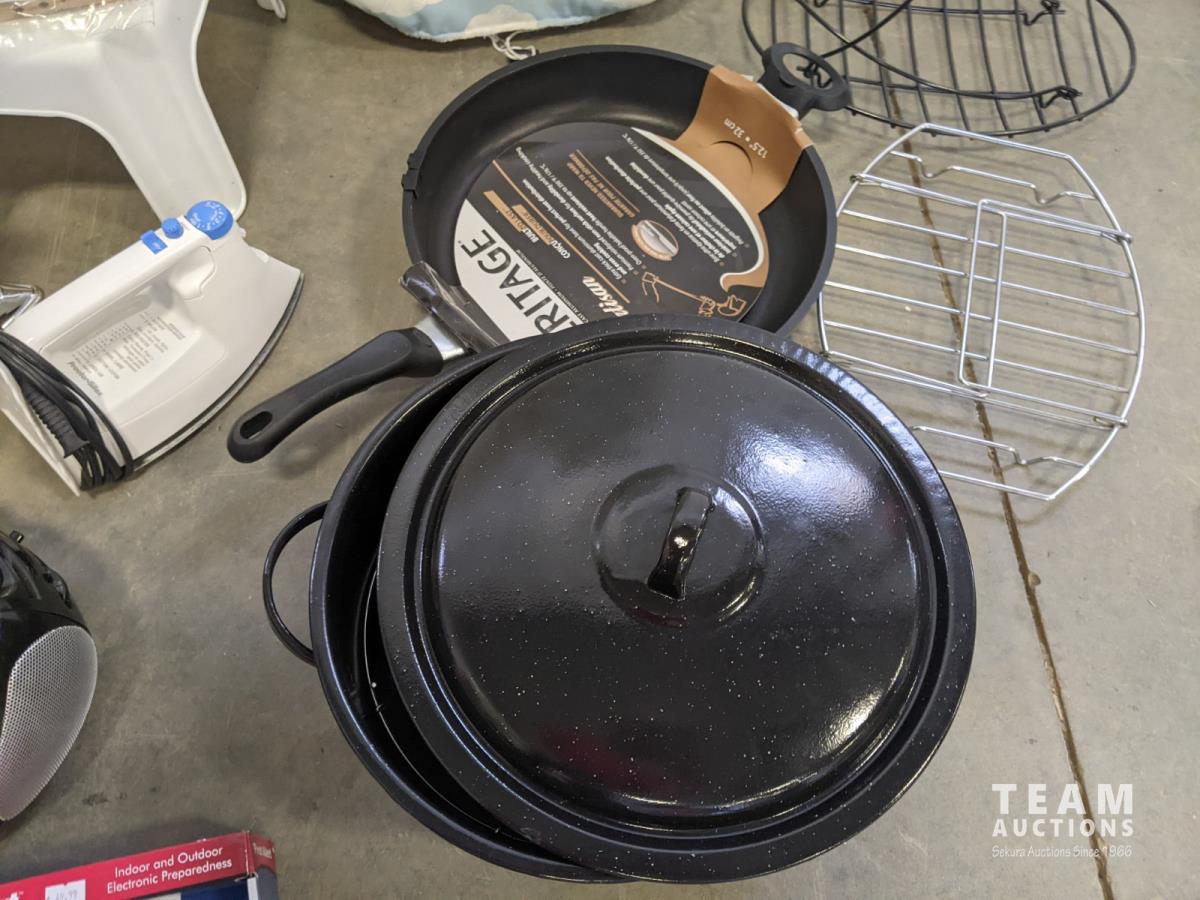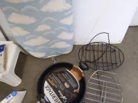 Mr. Clean car wash system, LED puck lights, (2) irons, pickling canister, CD player, ironing board. Frying pan, radio, wicker basket, 10 w pond fountain spotlight and first alert system