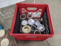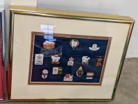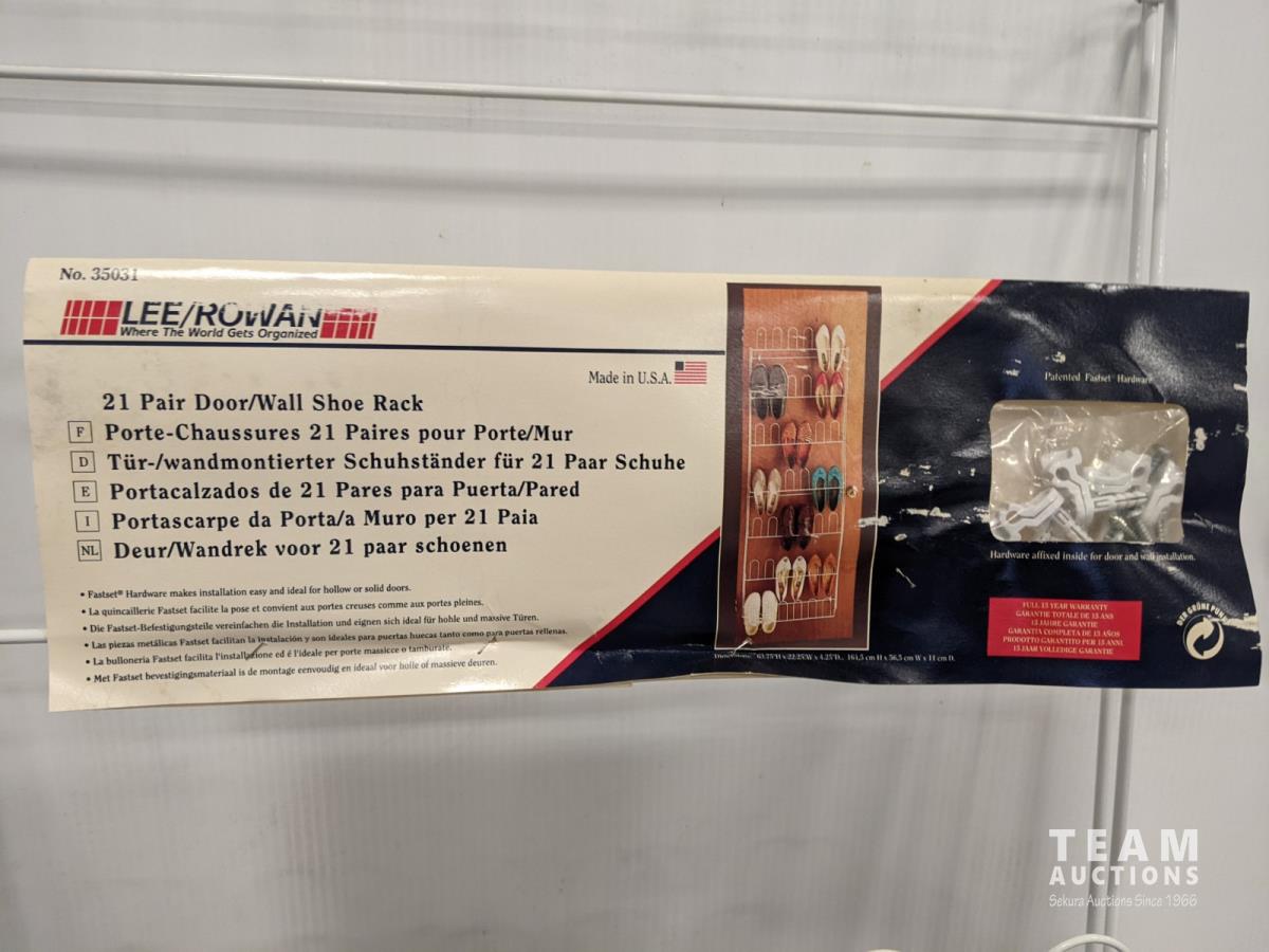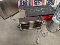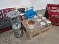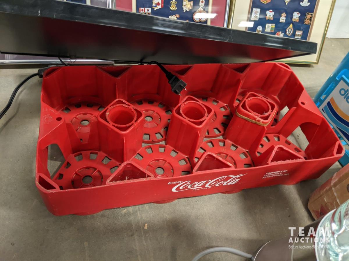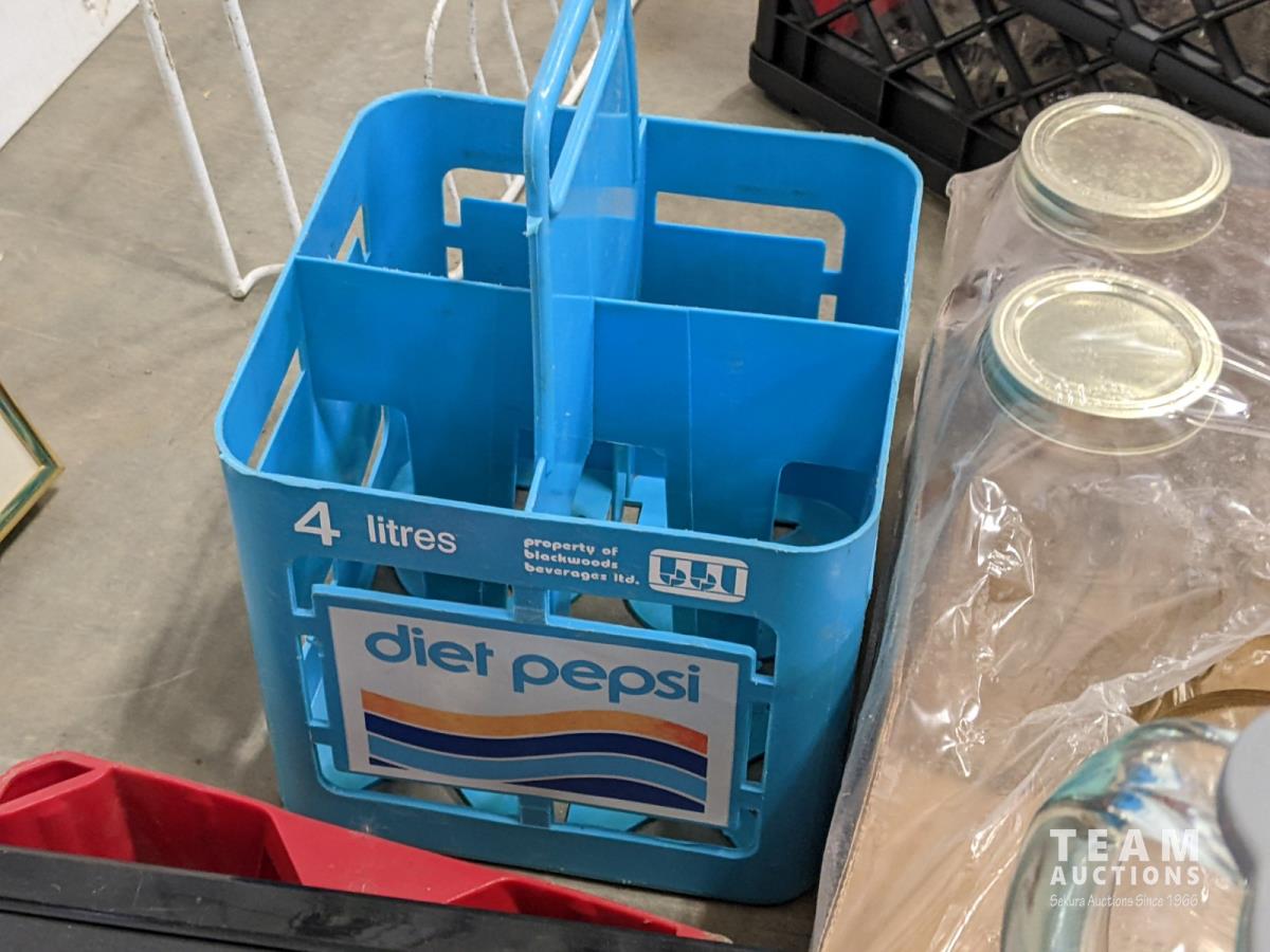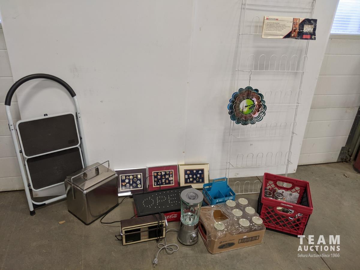 21 pair door/wall shoe rack, (3) pin collection, cooler, coca-cola and diet pepsi crates, jars, open sign, blender, 2 step ladder and radio