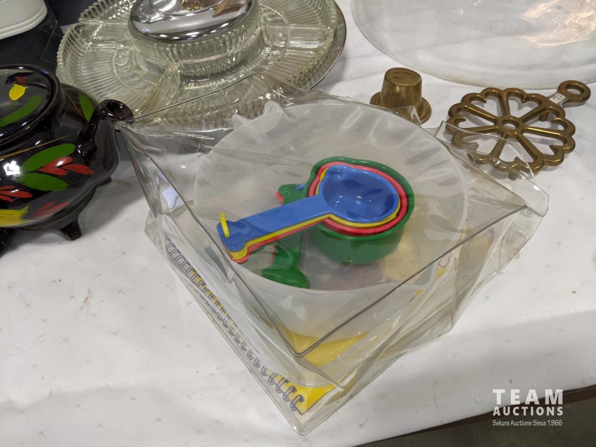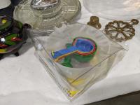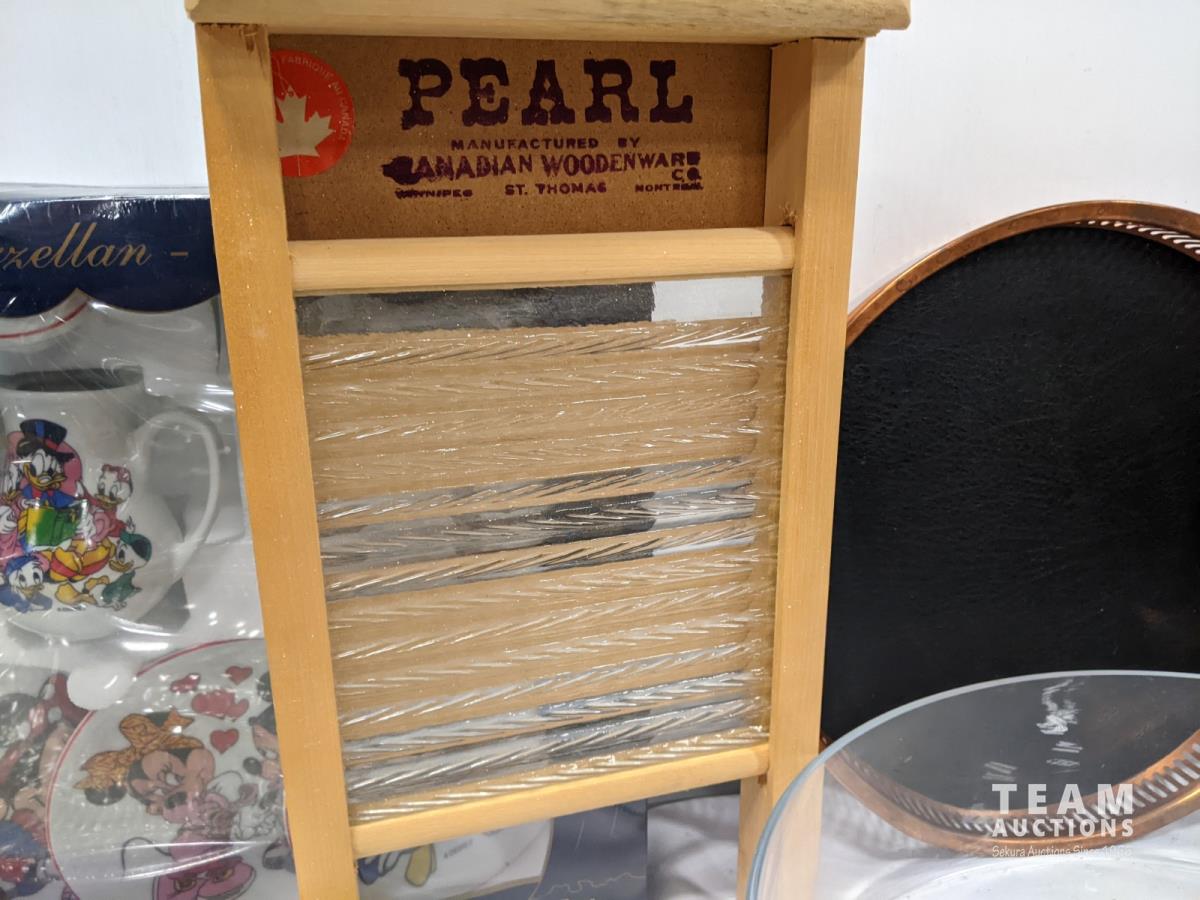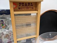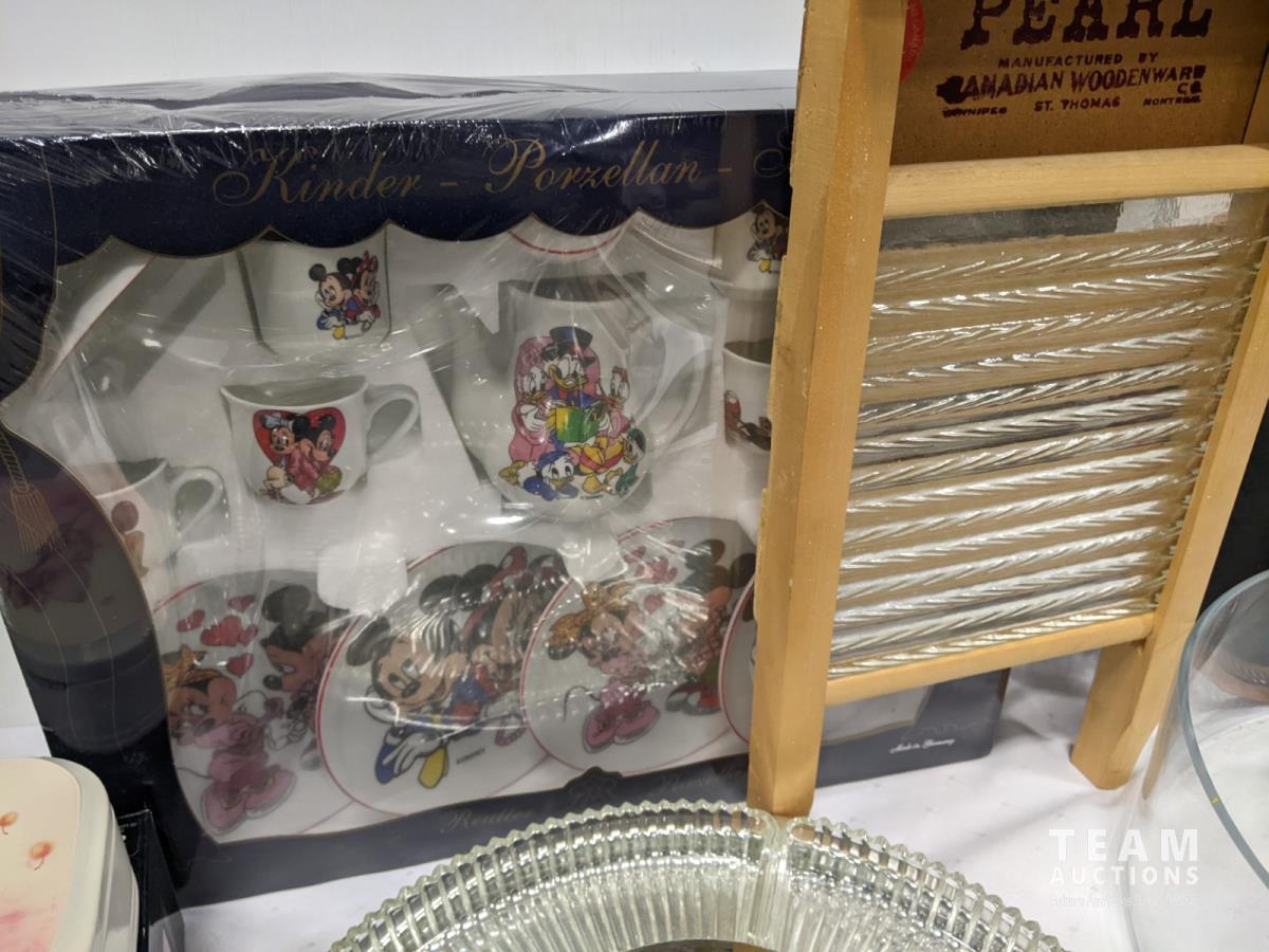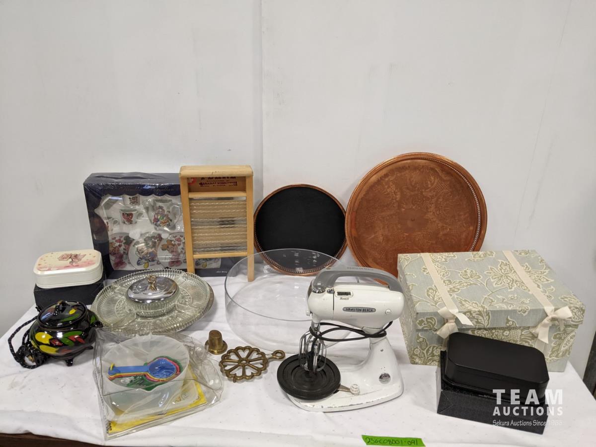 Assortment of trays, storage boxes, kid measuring cups and cookbook, mickey mouse tea set, vintage mixer, wash board, electric kettle, trivot and (2) jewelry boxes