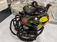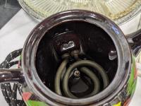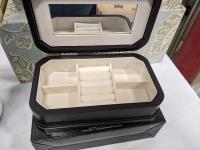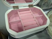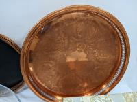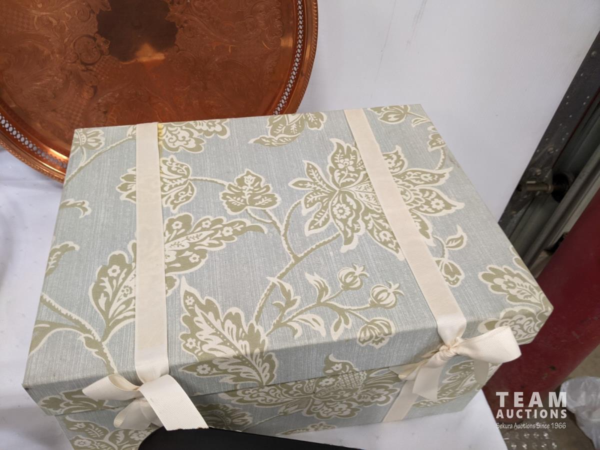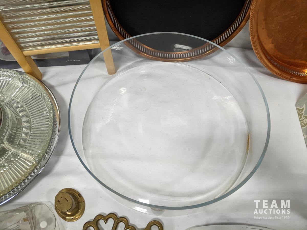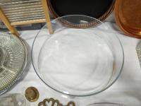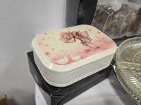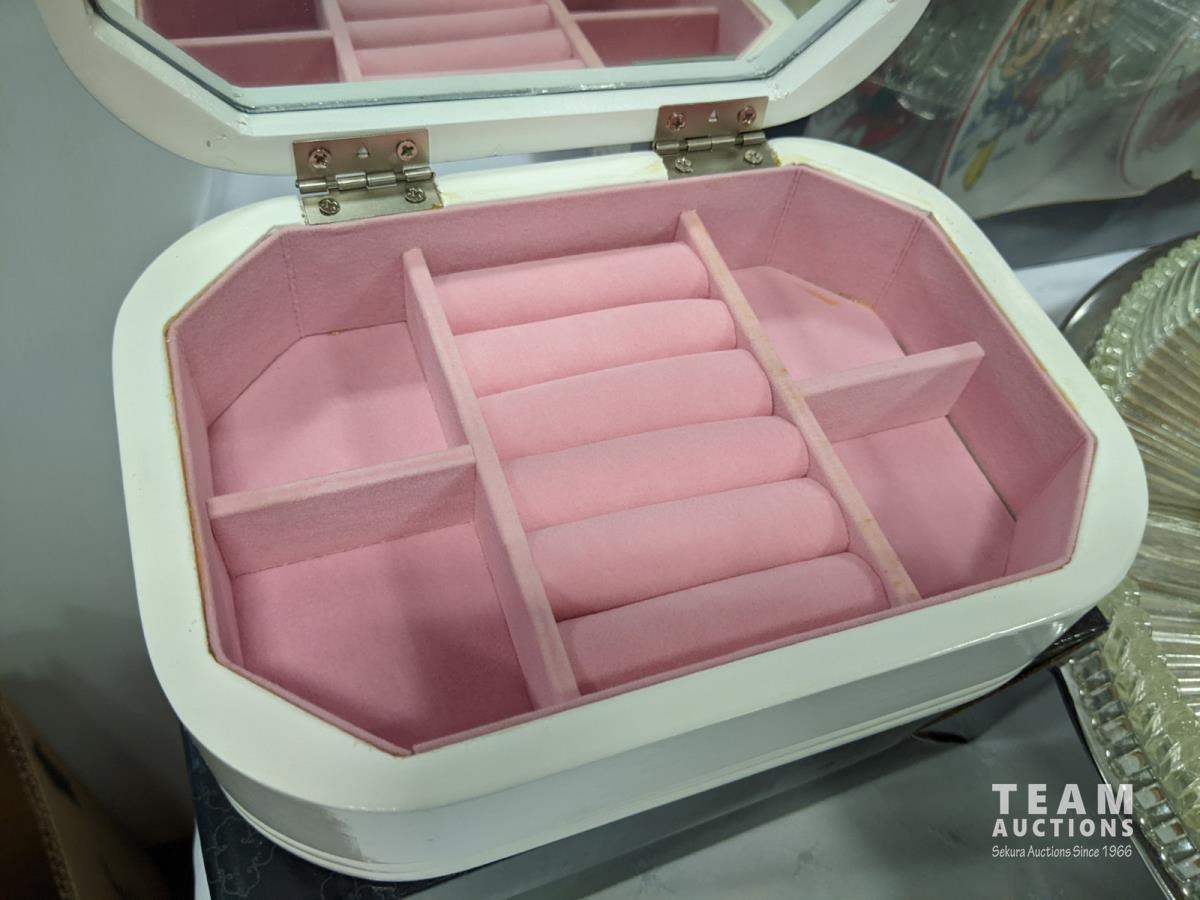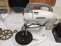 Assortment of trays, storage boxes, kid measuring cups and cookbook, mickey mouse tea set, vintage mixer, wash board, electric kettle, trivot and (2) jewelry boxes