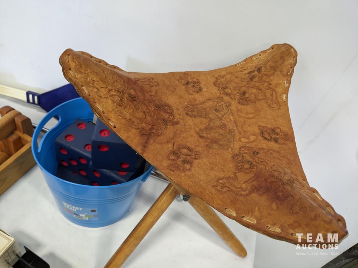 Giant yahtzee game, horse shoes, 16 inch x 16 inch griddle, (2) leather folding stools and cards