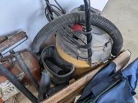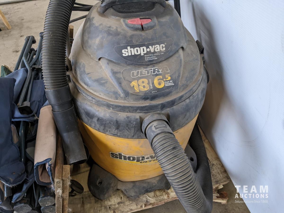 Lawn chairs, roller stands, creeper and 18 gallon shop-vac