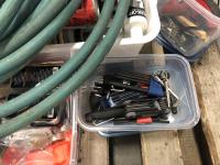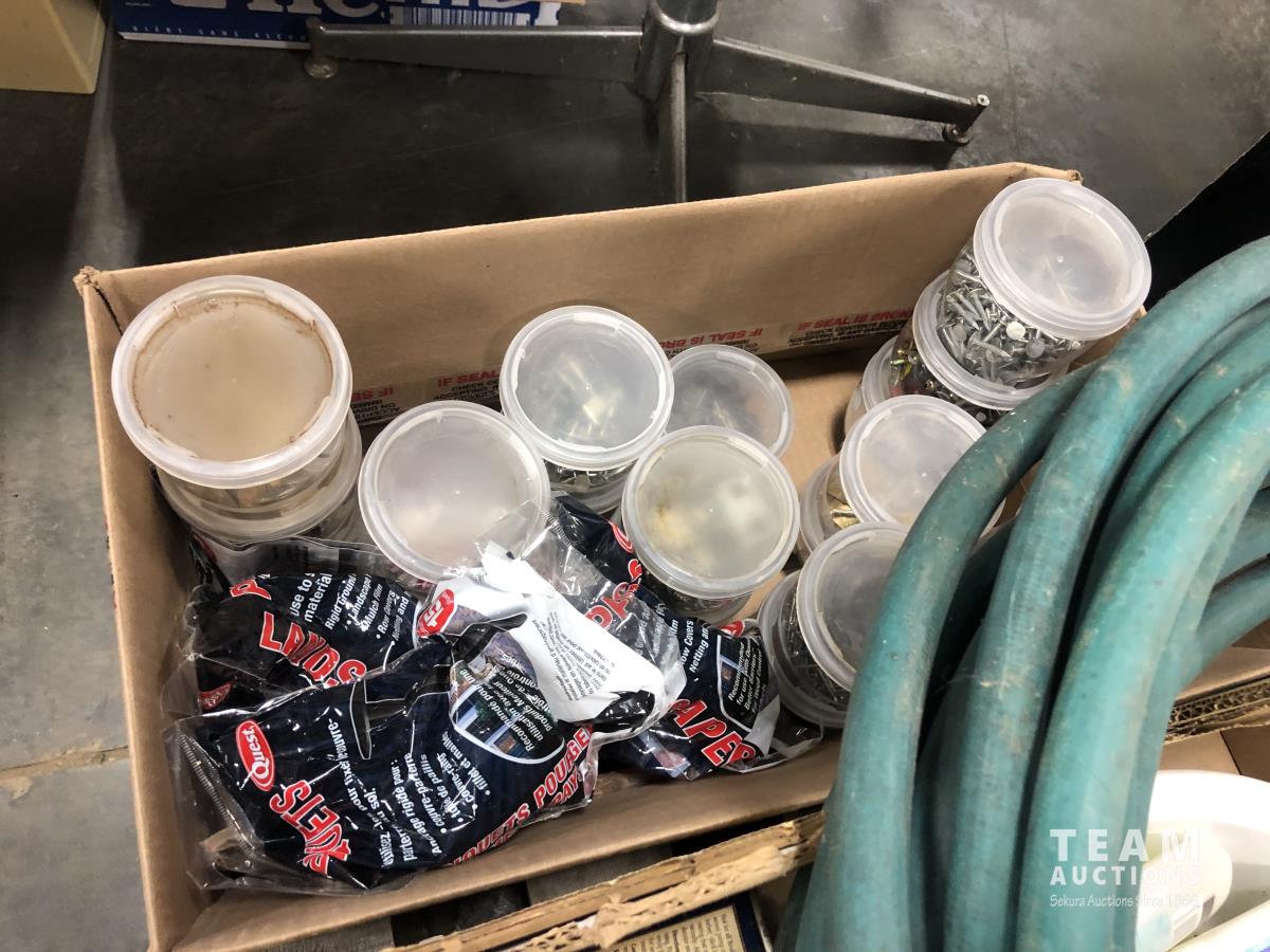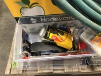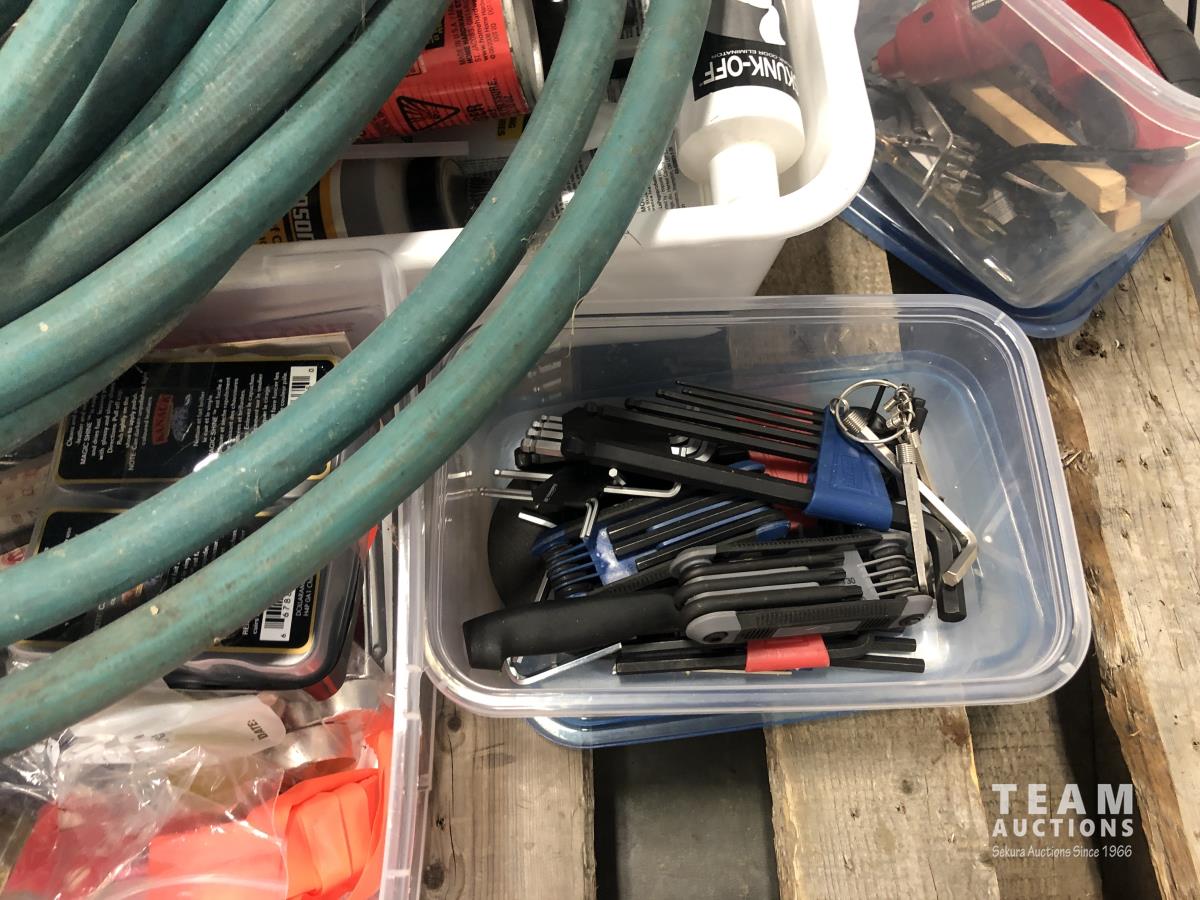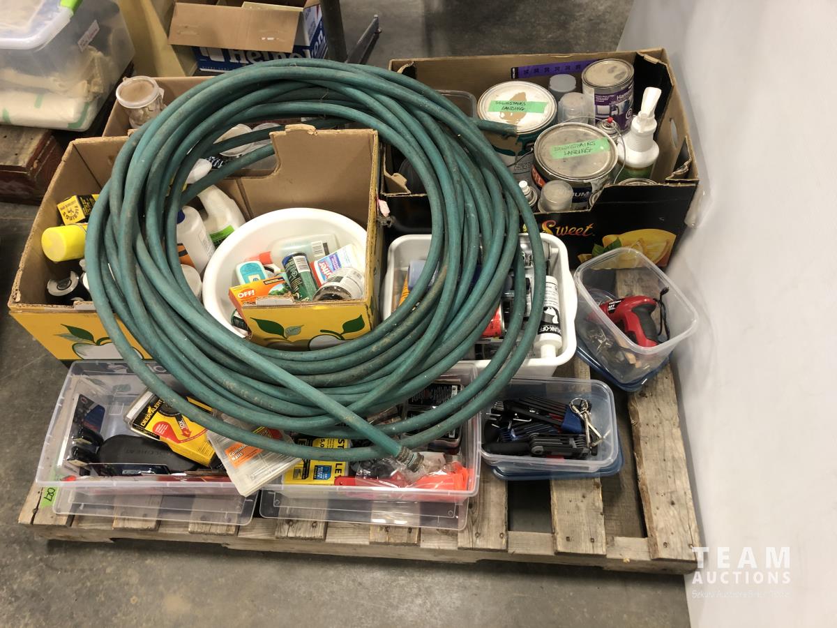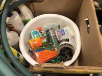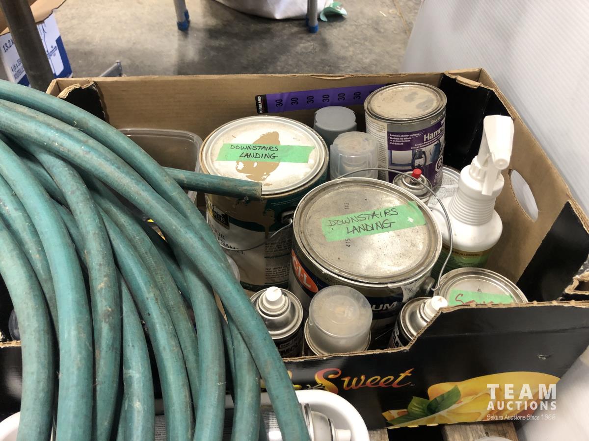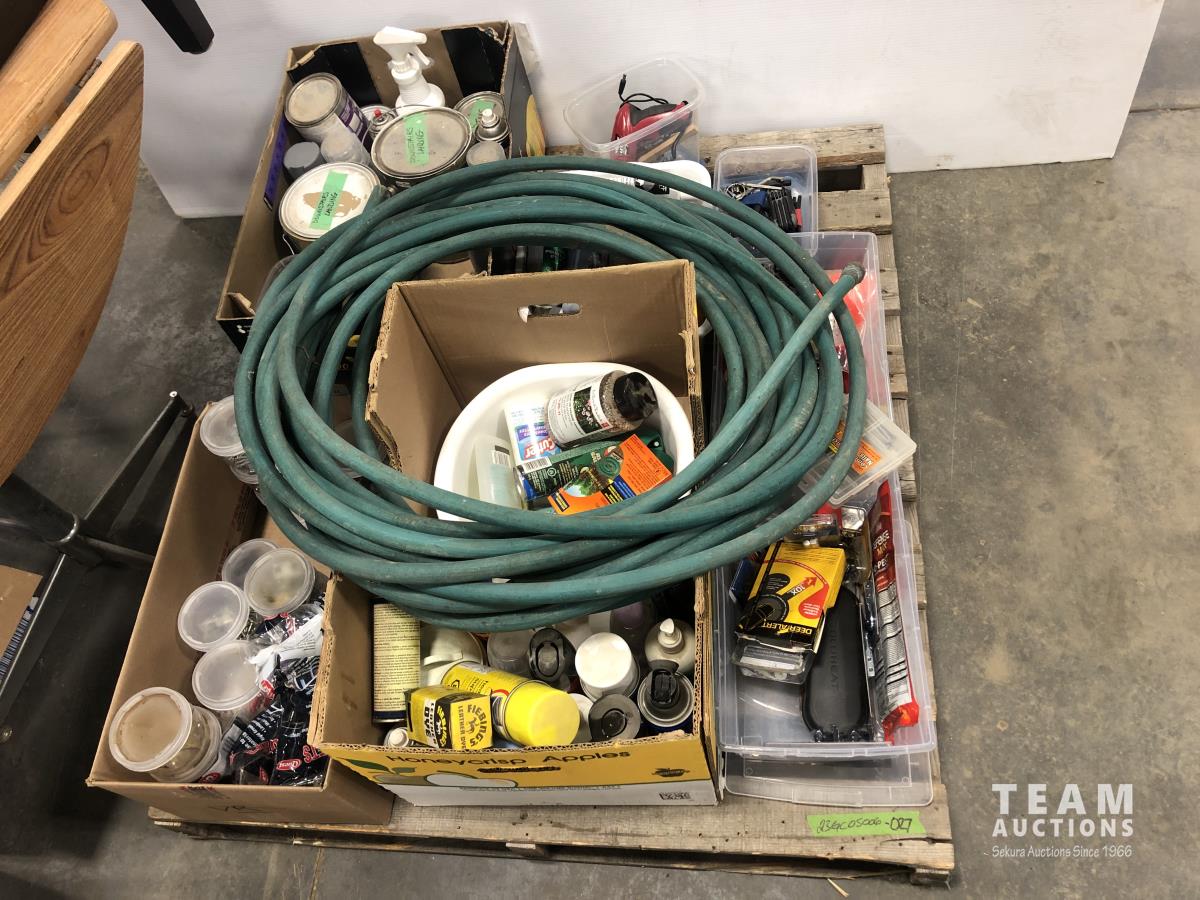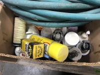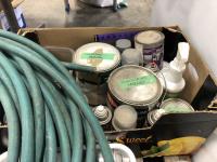 Assortment of paints, shop fluids, allen wrenches, garden hoses and deer whistles