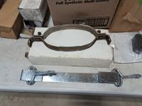 Box of assorted metal strap hangers for exhaust, box of exhaust hardware insulators, box of rubber exhaust hangers and heat wrap to stop exhaust rattle
