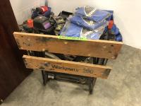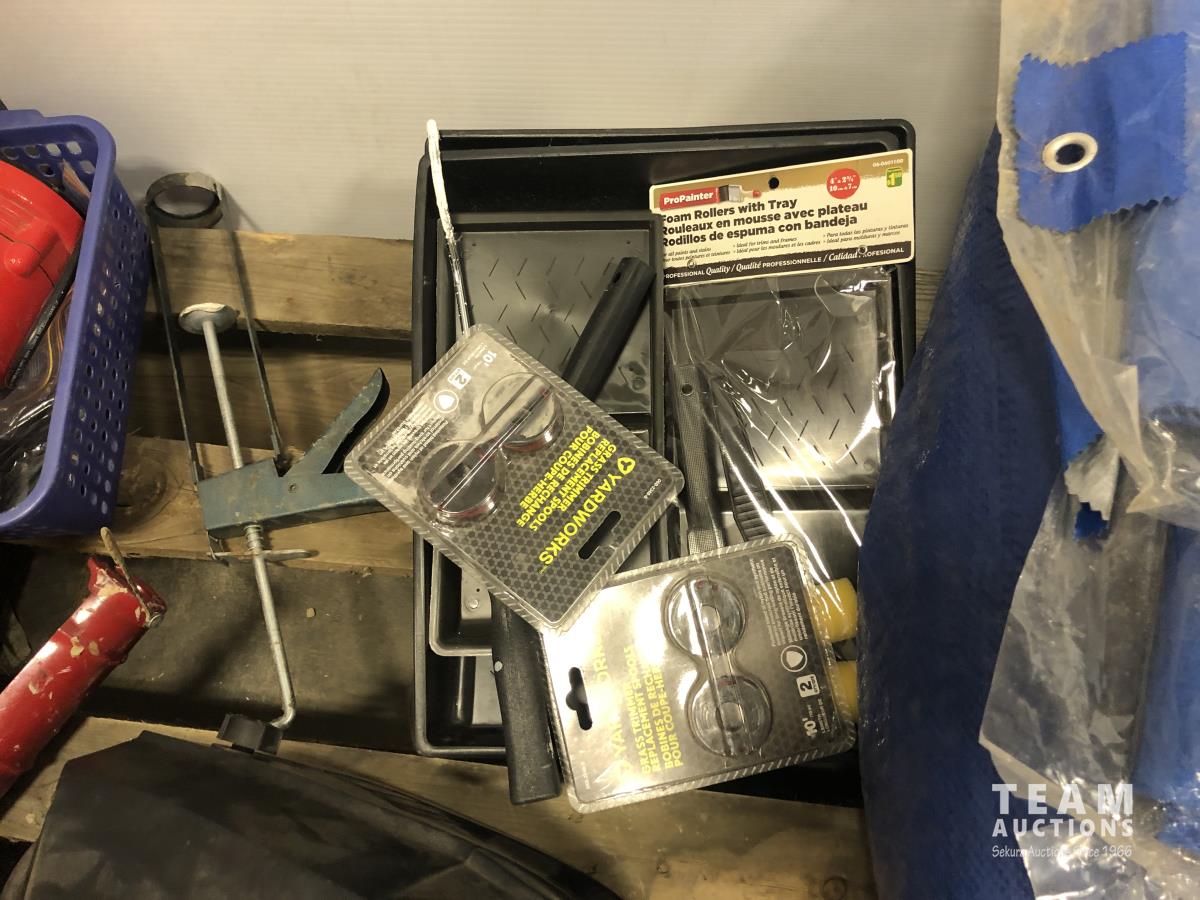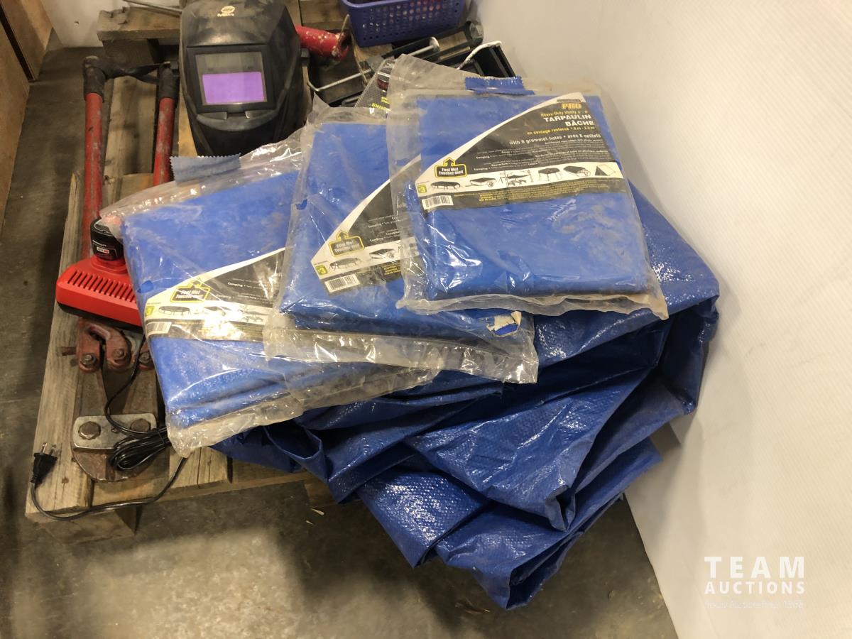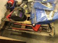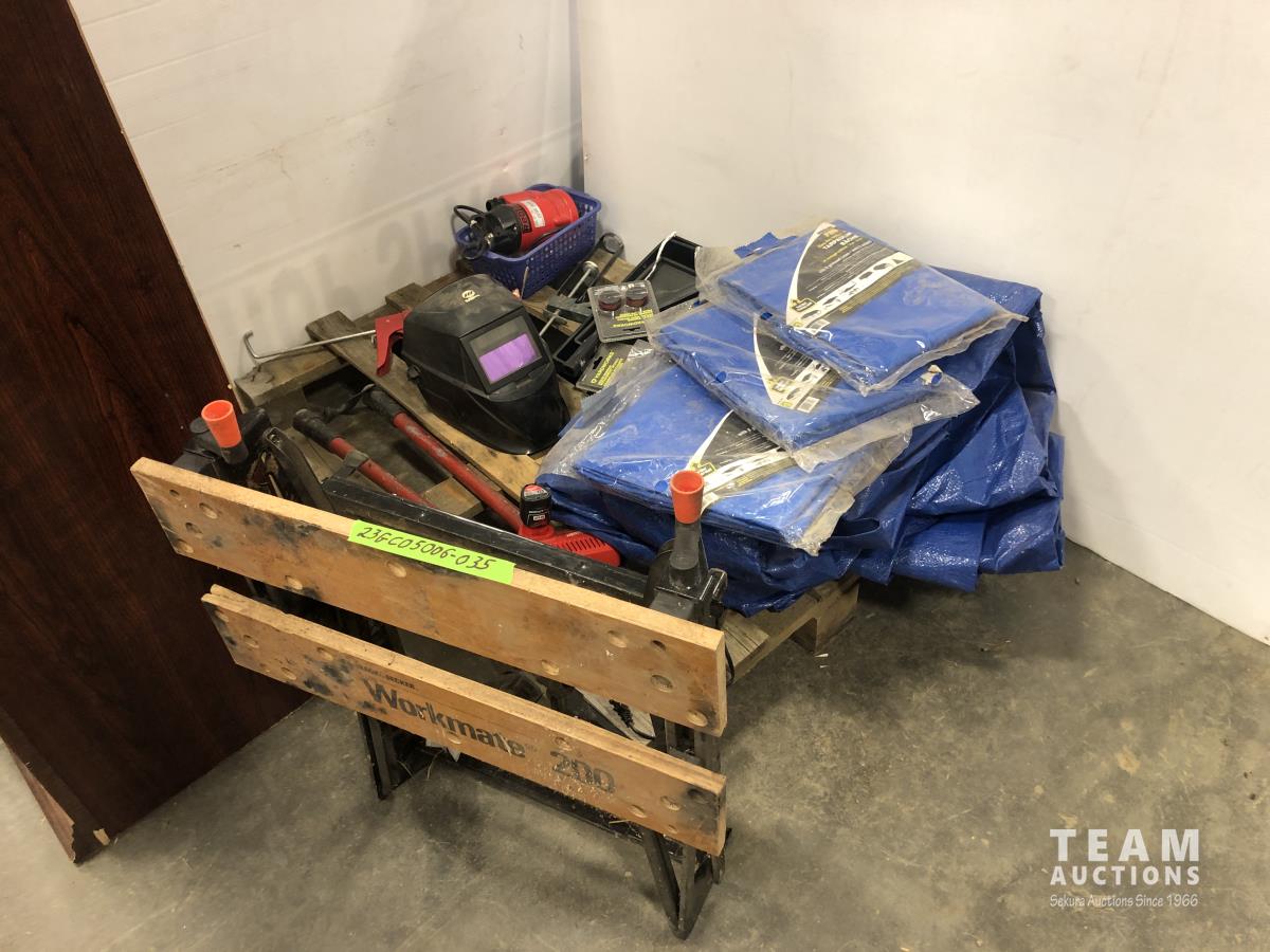 Assortment of poly tarps, foldable work bench, bolt cutters, welding mask, painting supplies and Red Lion sump pump