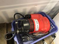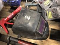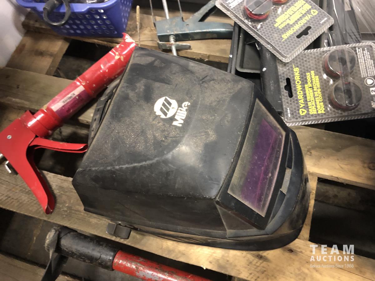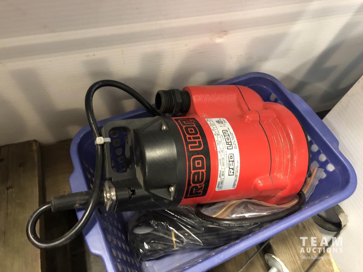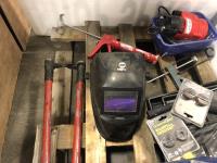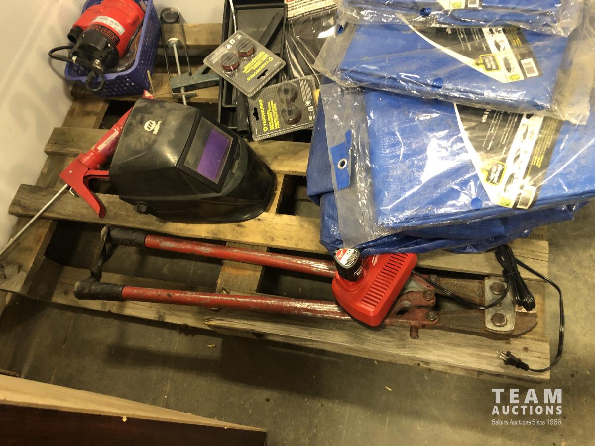 Assortment of poly tarps, foldable work bench, bolt cutters, welding mask, painting supplies and Red Lion sump pump