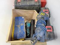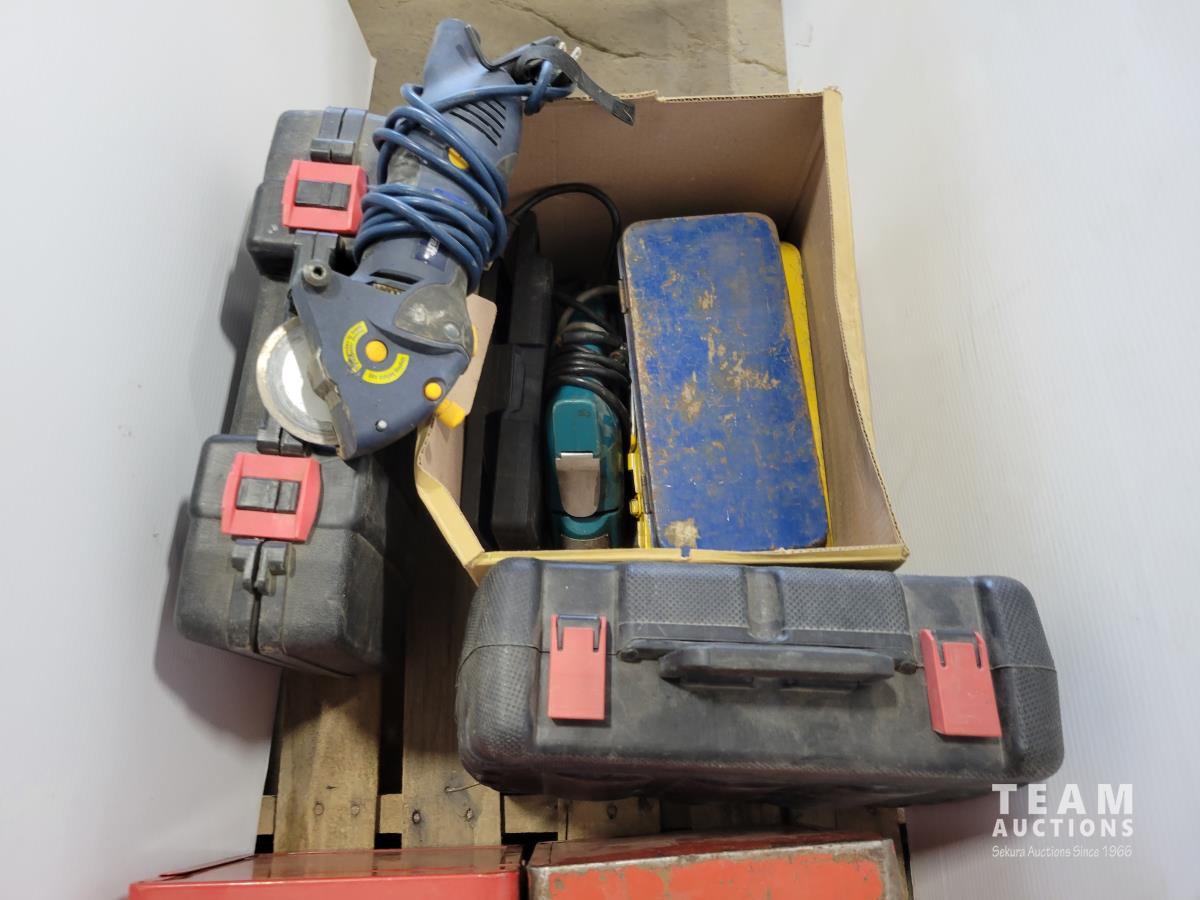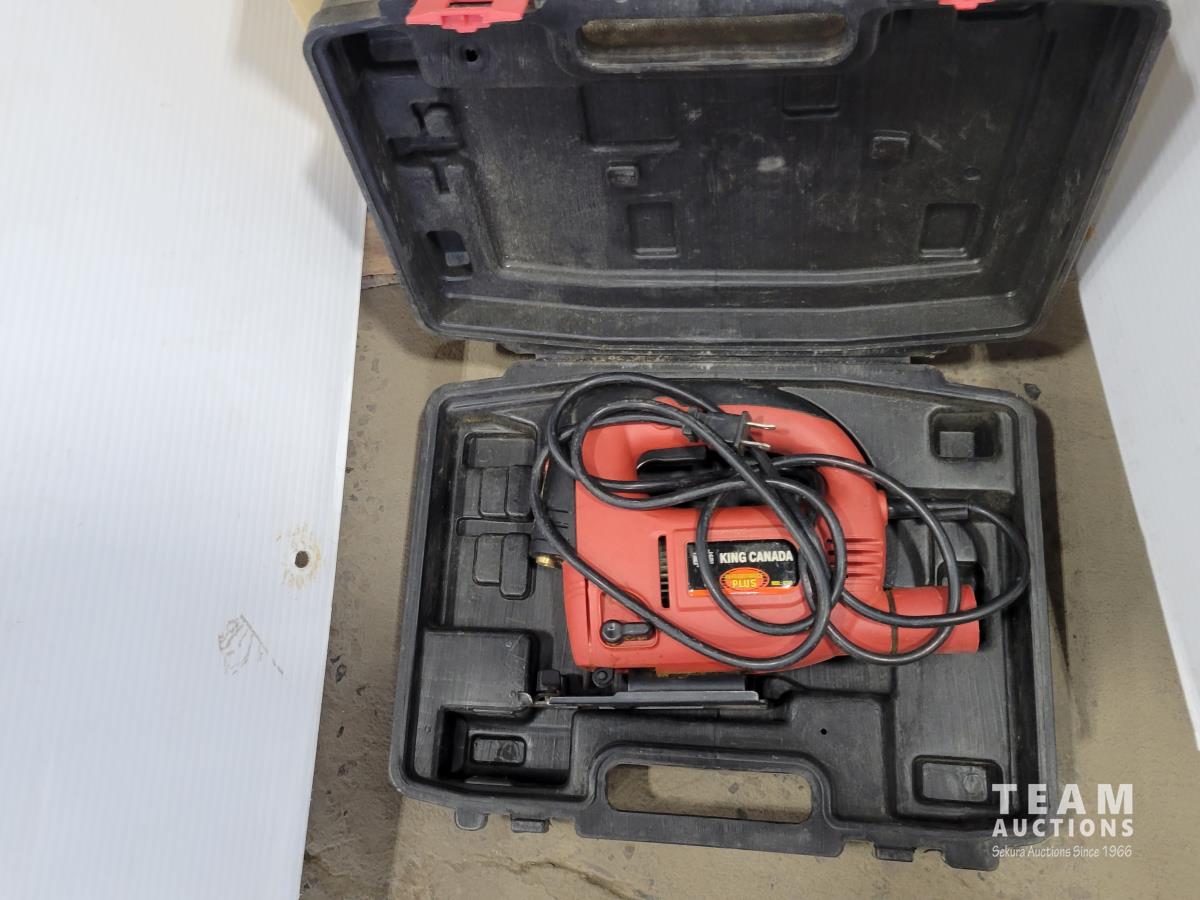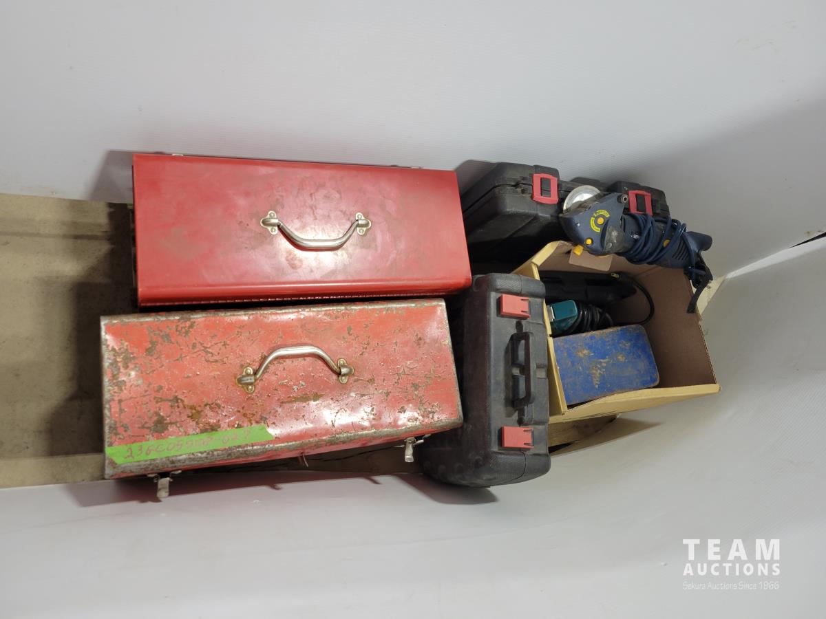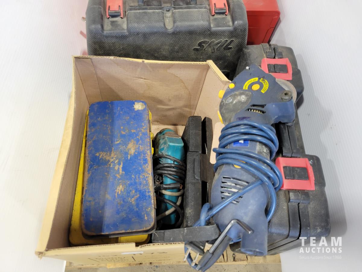 Skil 14.4V drill with charger, metal tool boxes with contents, King Canada jig saw, Mastercraft multi-purpose saw, stapler, electric staple gun, assorted socket sets