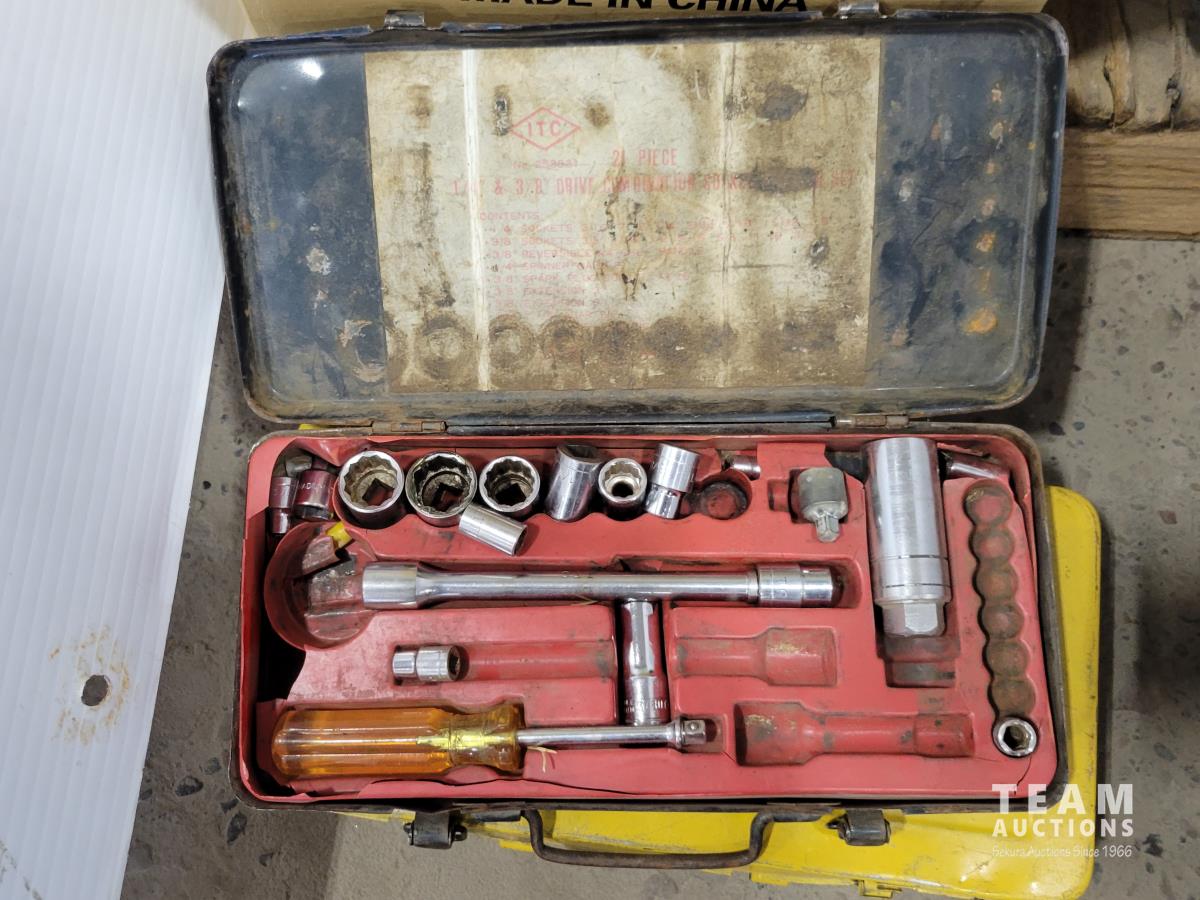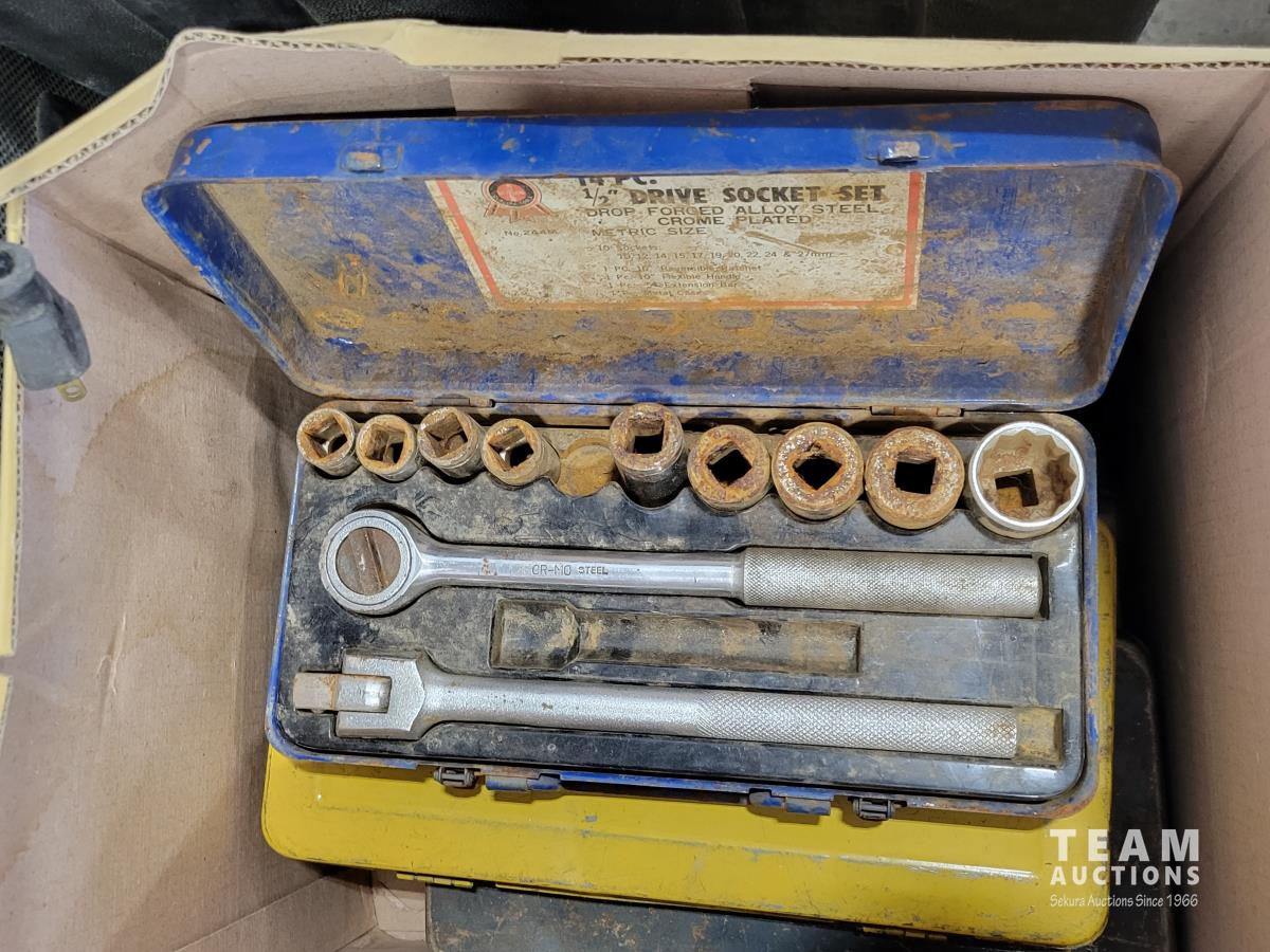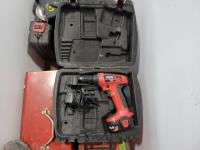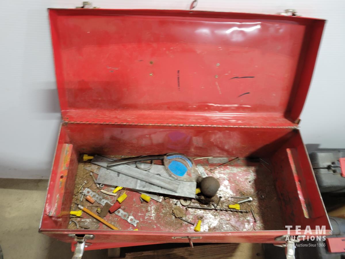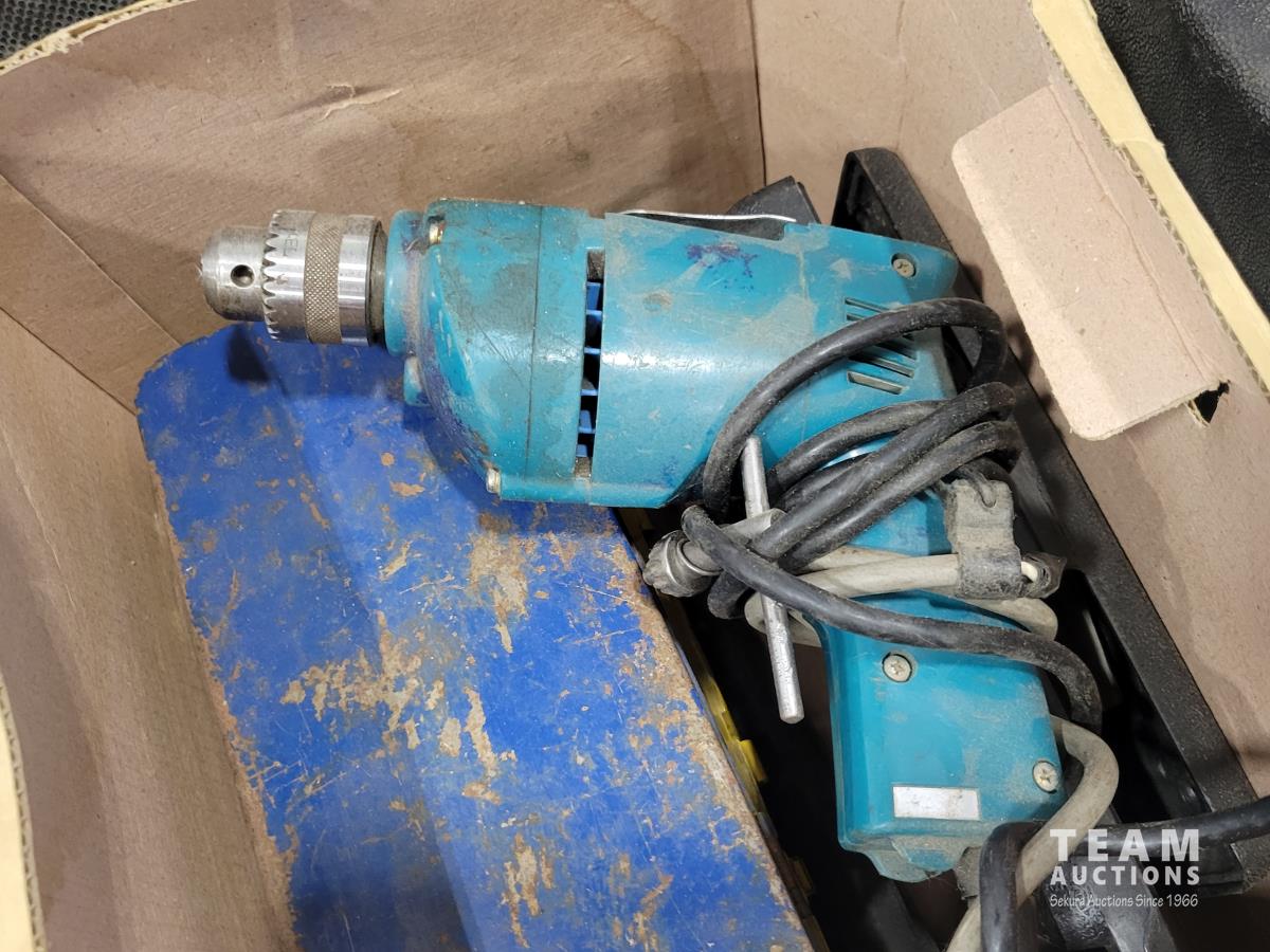 Skil 14.4V drill with charger, metal tool boxes with contents, King Canada jig saw, Mastercraft multi-purpose saw, stapler, electric staple gun, assorted socket sets