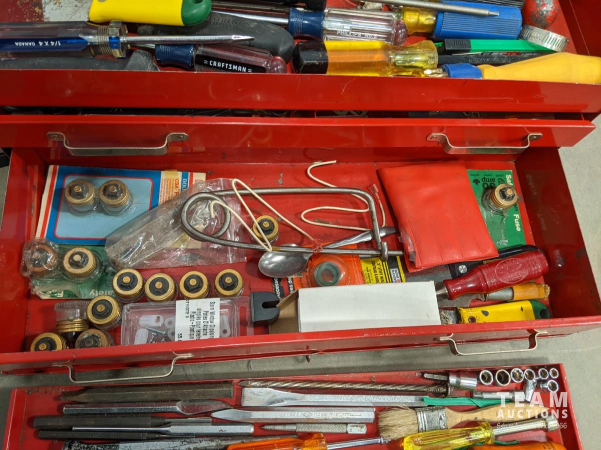 Tool box with bernzomatic, loctite, file, 14 piece 3/8 inch drive socket wrench set, tool box with assorted tools (screwdrivers, fuses, files, hammer), poster and hand saw