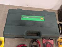 John Deere 18v drill and flashlight, battery charger, tool boxes with assorted tools, clamps, Dewalt 37 bit set and trouble light