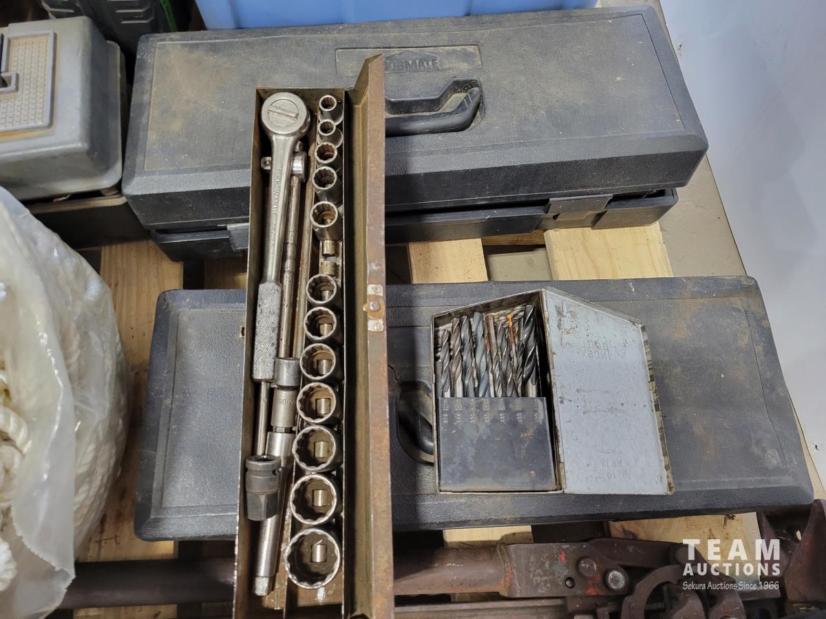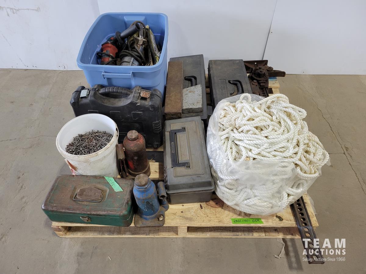 Jackall, qty of rope, (2) bottle jacks, Home shop 18v cordless drill, tow rope, Hilti 5 inch angle grinder and socket set