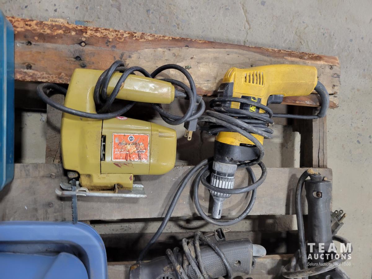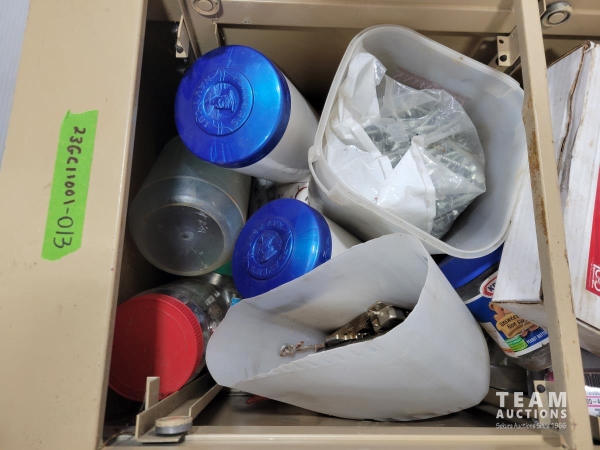 Filing cabinet with various hardware, spark plugs, grease guns, wrenches, ball hitches, Makita 10mm cordless drill kit, black & decker jig saw, Dewalt VSR drywall screwdriver and black & decker 7" heavy duty angle sander