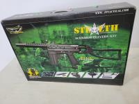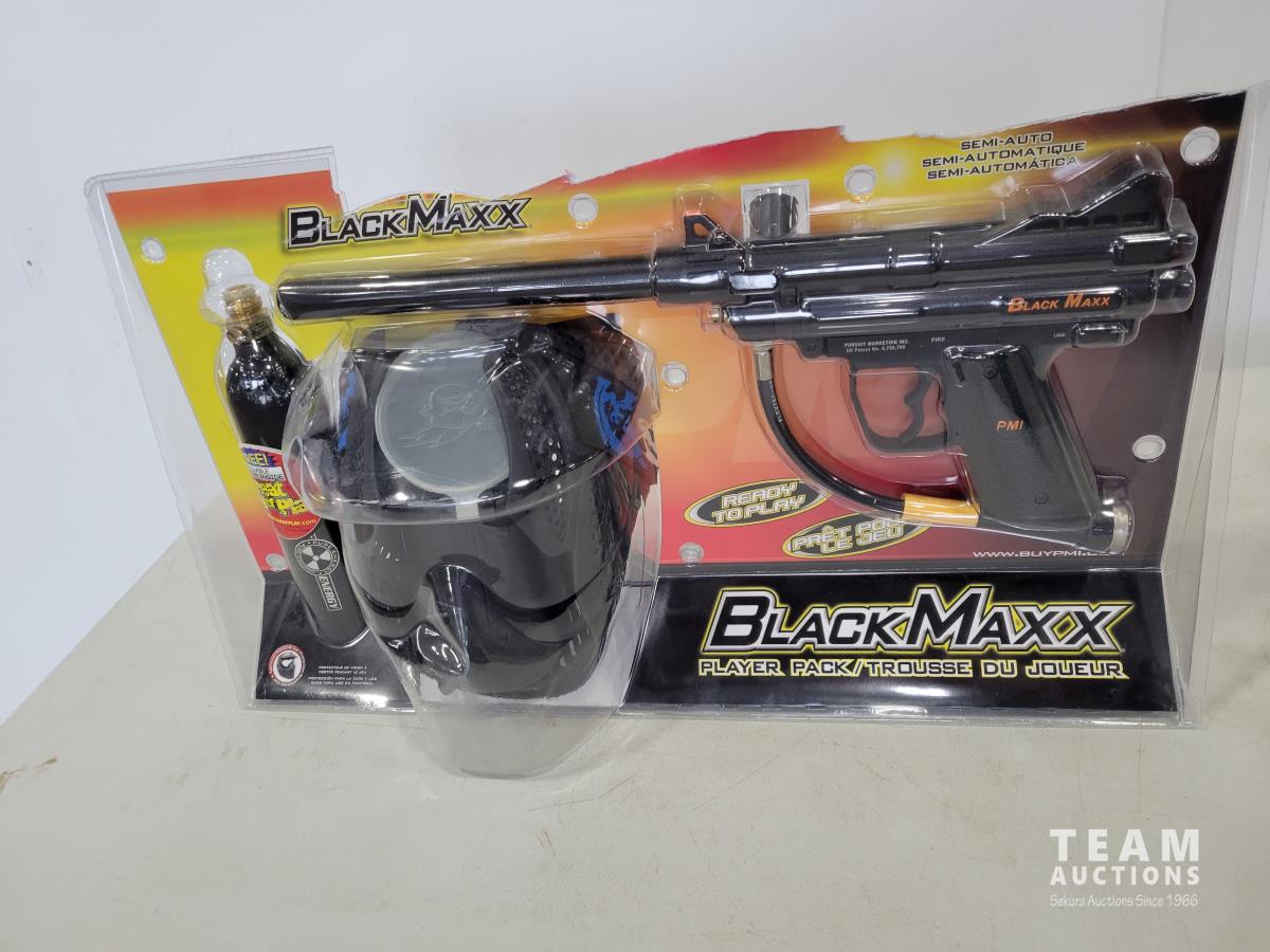 Blackmaxx player pack, 20 oz refillable co2 cylinder, (2) co2 cylinder, Dynasty stryker paintball gun, Extreme rage mask, (2) boxes of paintballs, Stealth scenario players kit