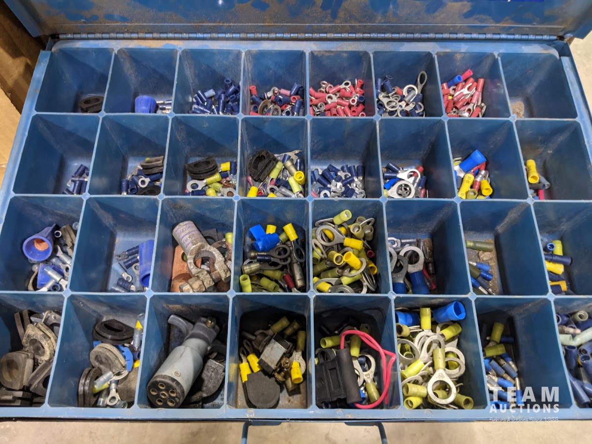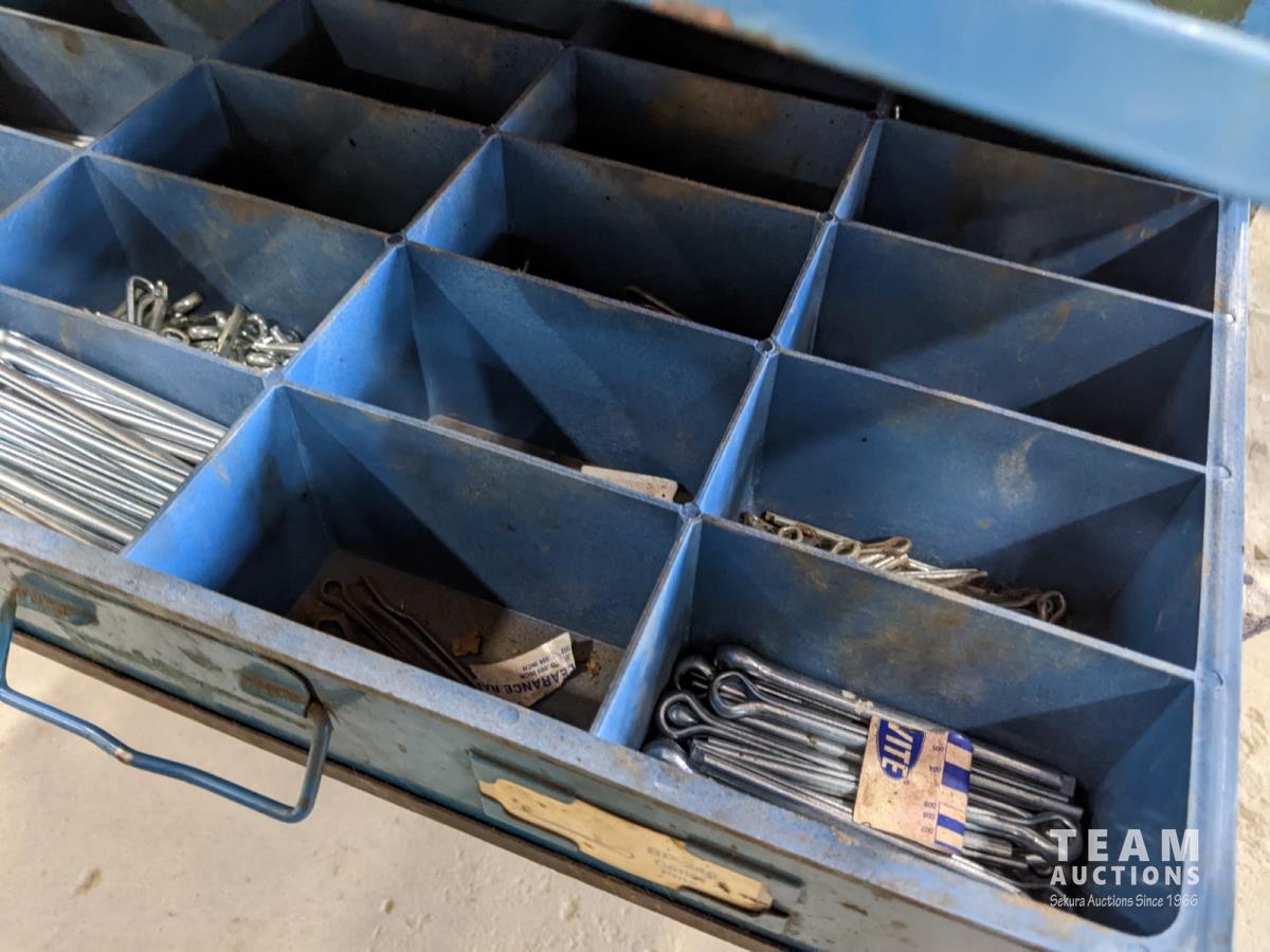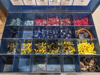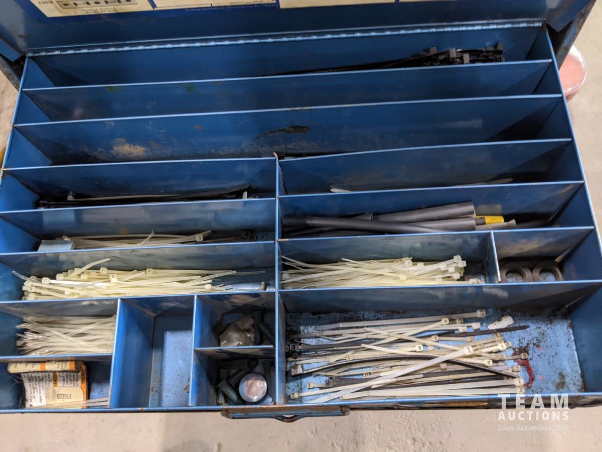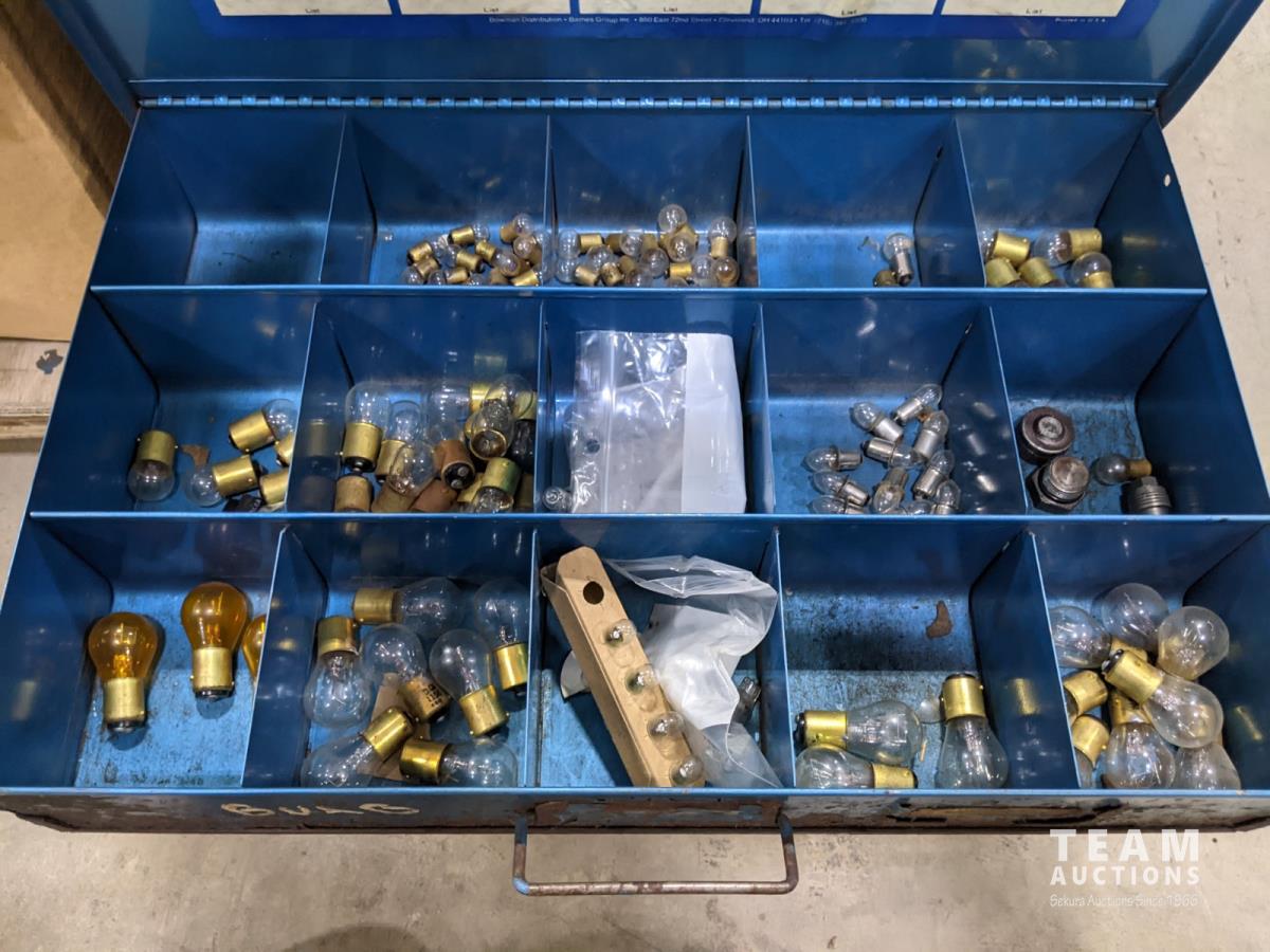Bench grinder, extension cords and bolt bins with contents