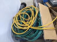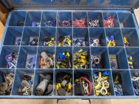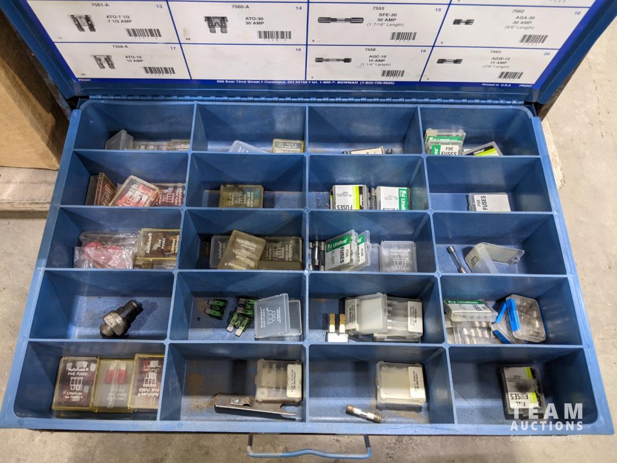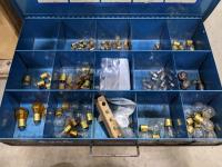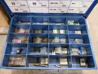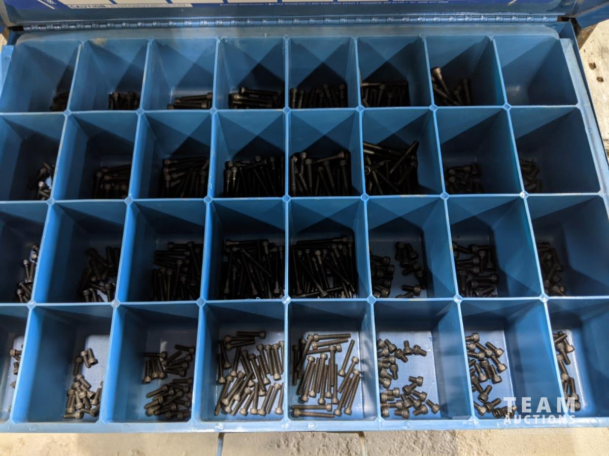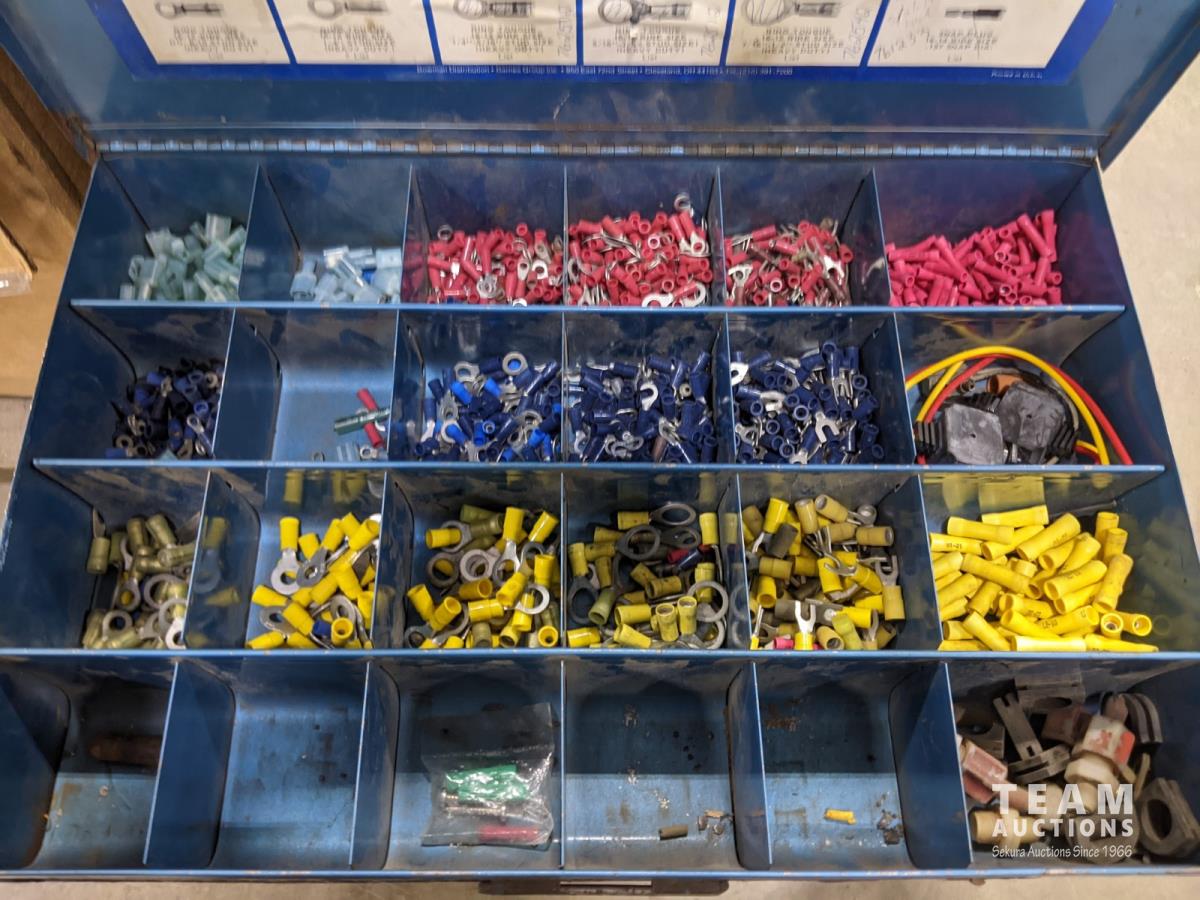 Bench grinder, extension cords and bolt bins with contents
