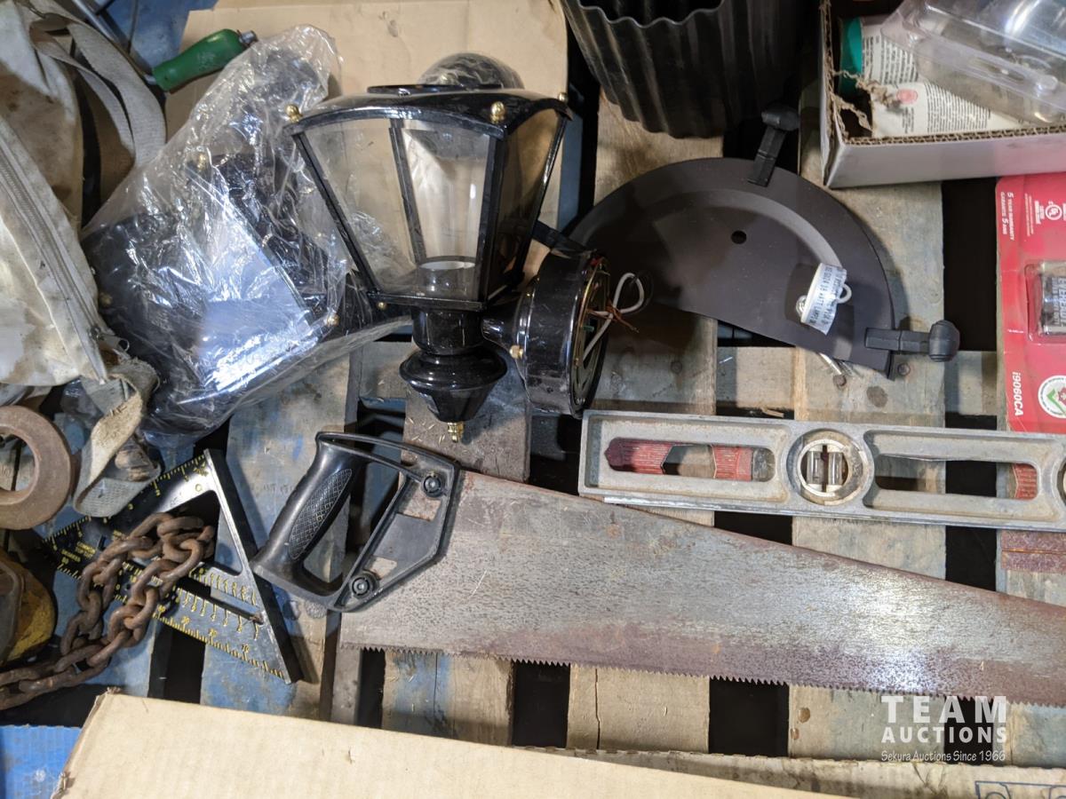 Chain come-a-long, saw, level, (4) rolls plastic lawn edging, grout and tile sealer, etc