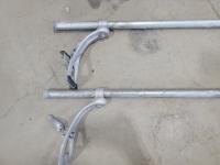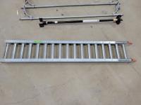 Pylex 50 inch deck post holder, shovel (missing handle), car roof racks, ramp, 64 inch pry bar, 7 ft pipe, pull cart
