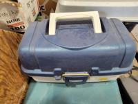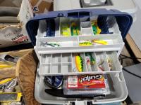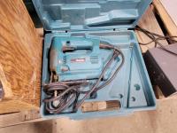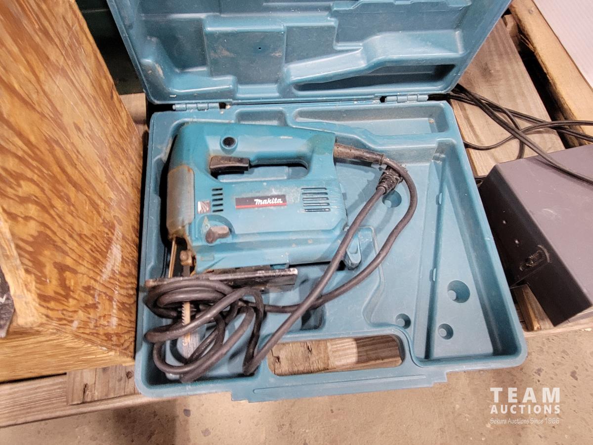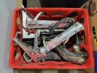 Space heater, carpenters box, tool box, fishing tackle box, Makita jig saw, trowels, plumbing snake, caulking guns, truck receivers, assorted fasteners