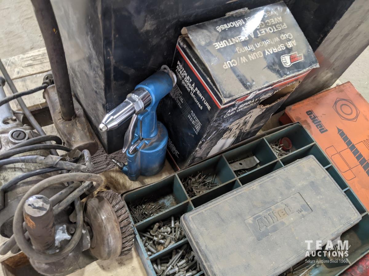 Hydraulic Porta Power, bolt bin with contents, paint sprayer and rivets