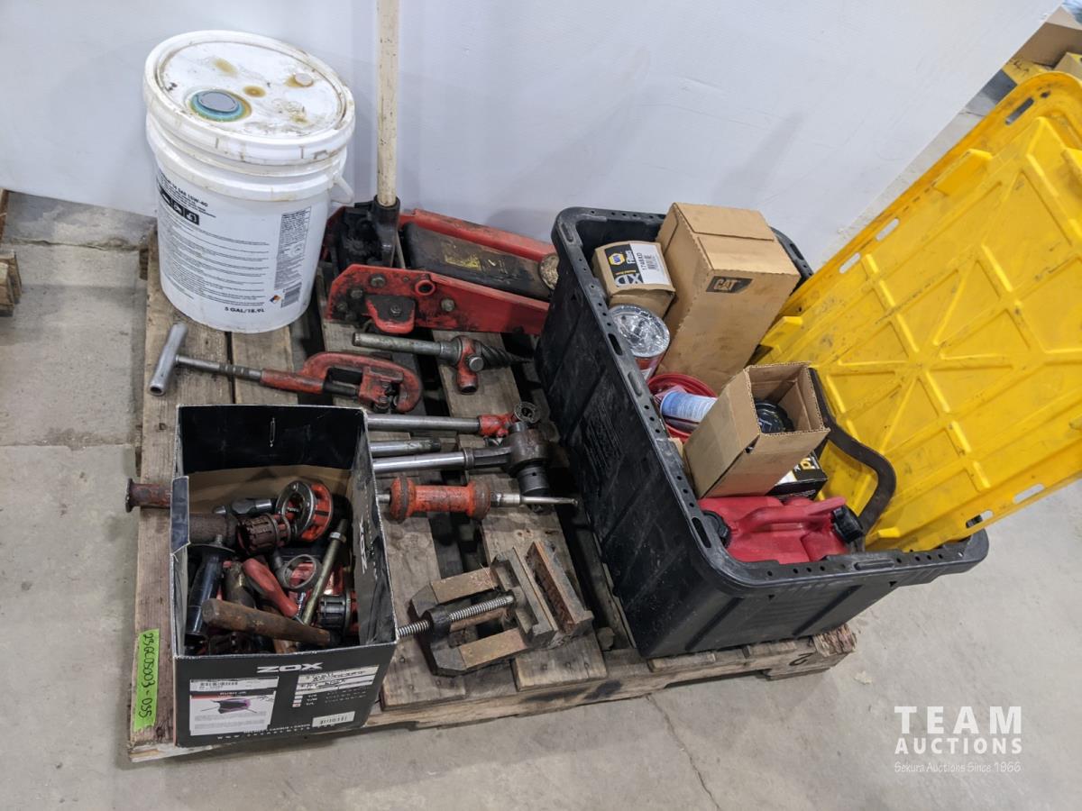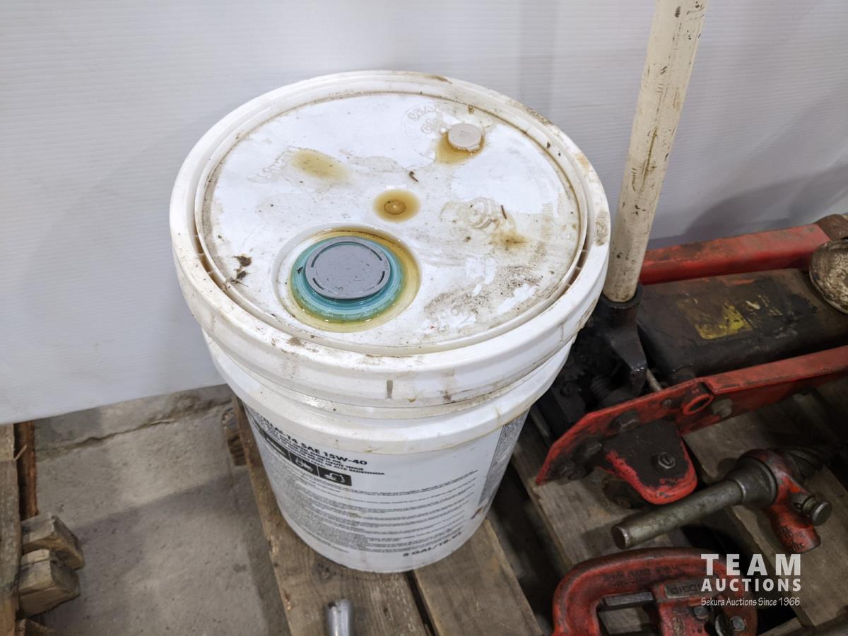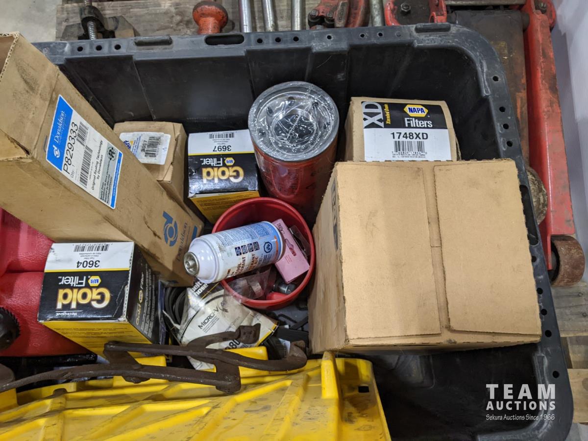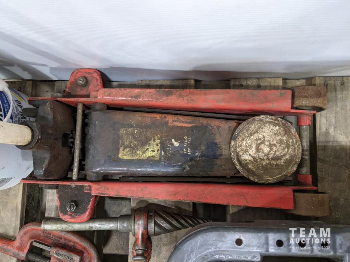 Ridged pipe threader, slide hammer, various filters, 3 ton hydraulic floor jack and partial pail of Shell 15w-40