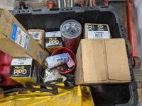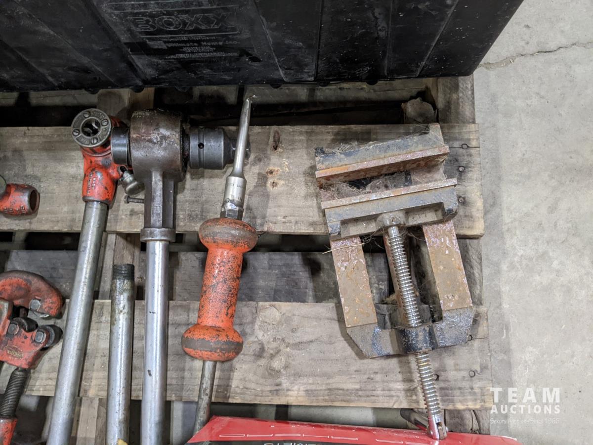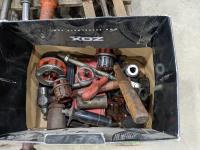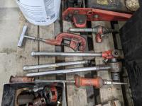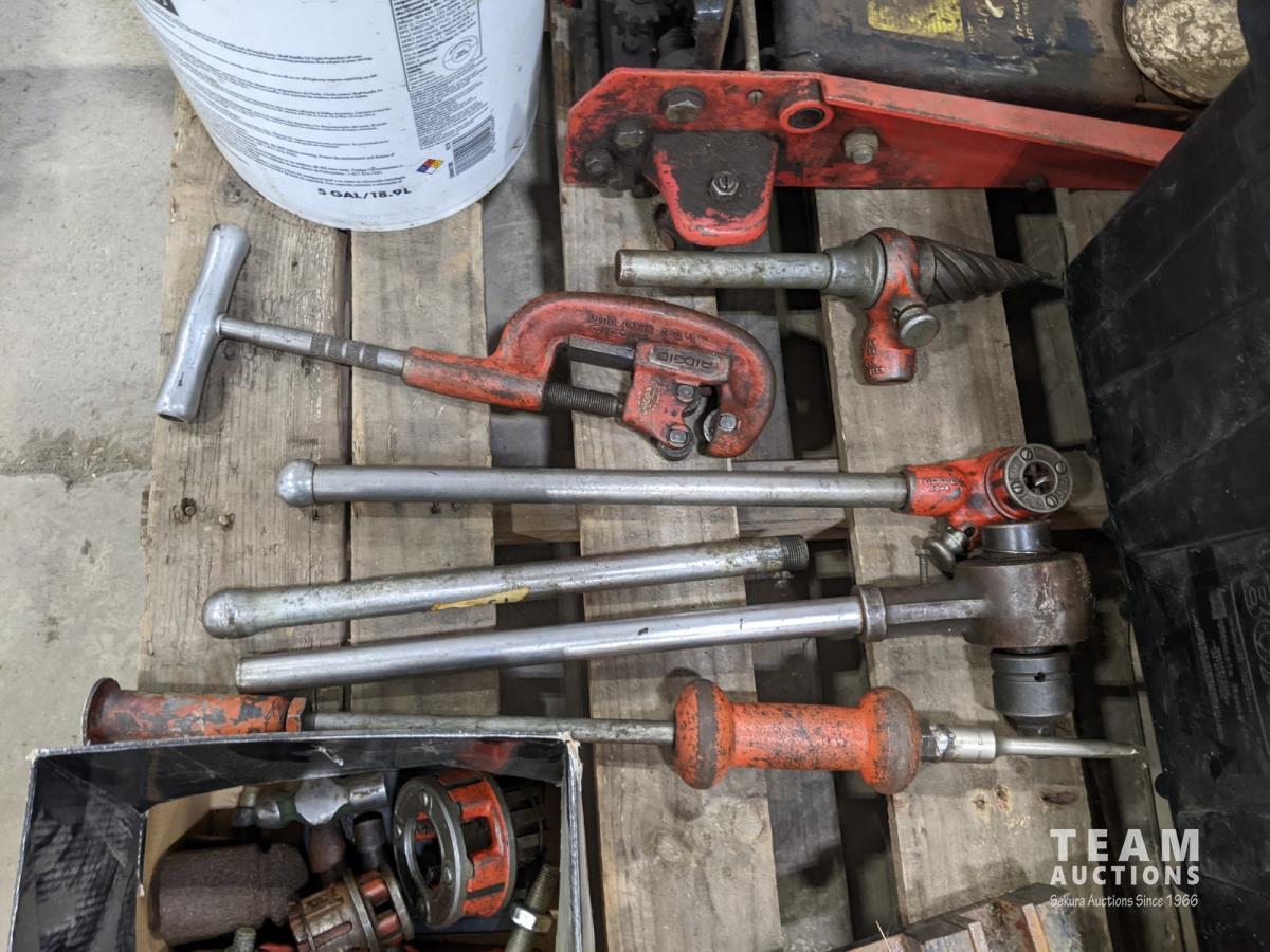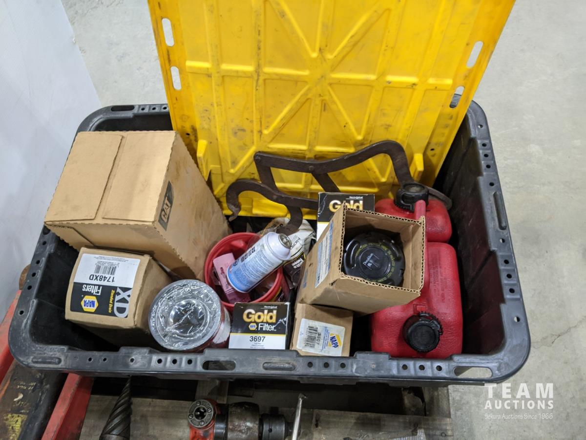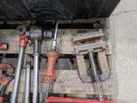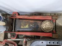 Ridged pipe threader, slide hammer, various filters, 3 ton hydraulic floor jack and partial pail of Shell 15w-40