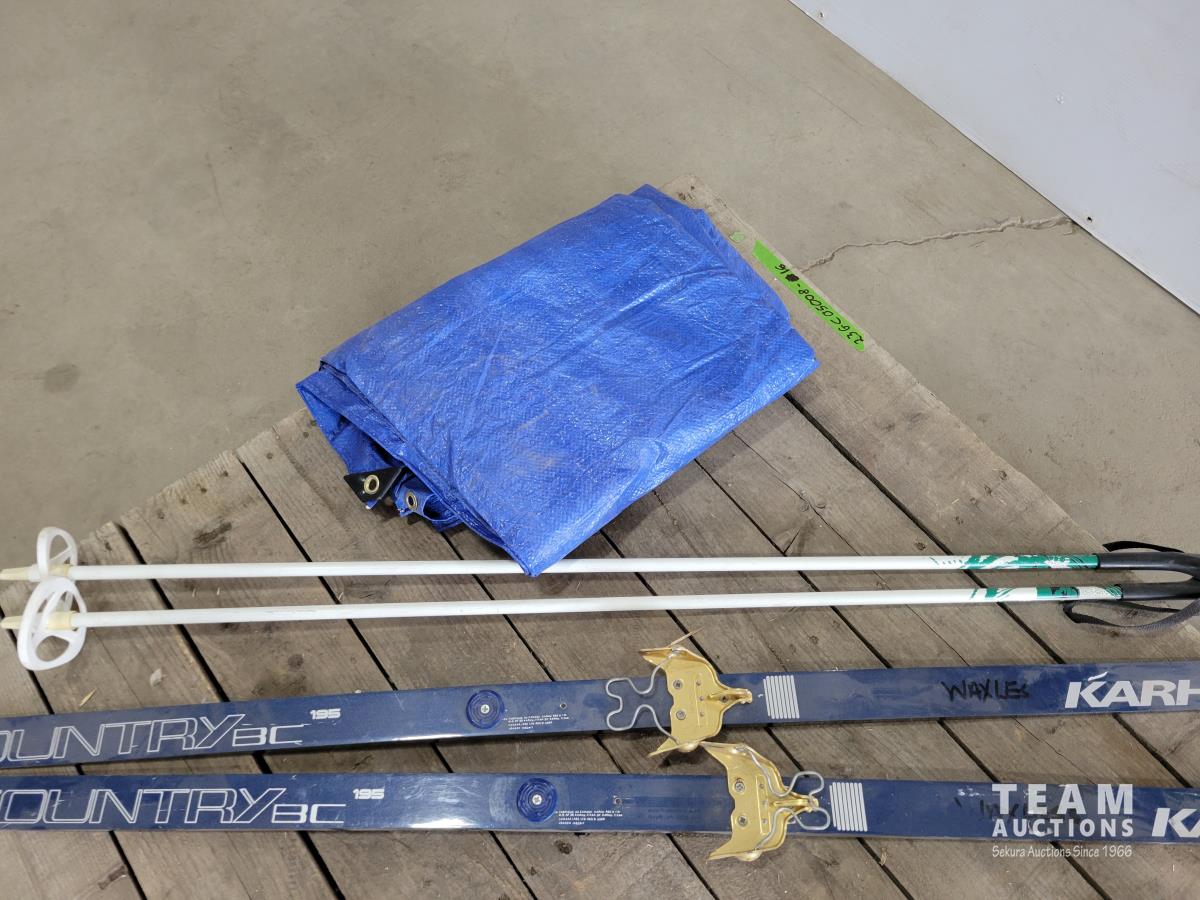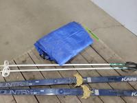(2) Sets of cross-country skis, (2) fishing rods with reels, lawn chair, tarp