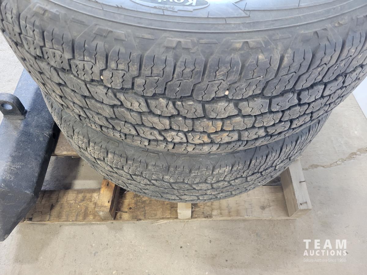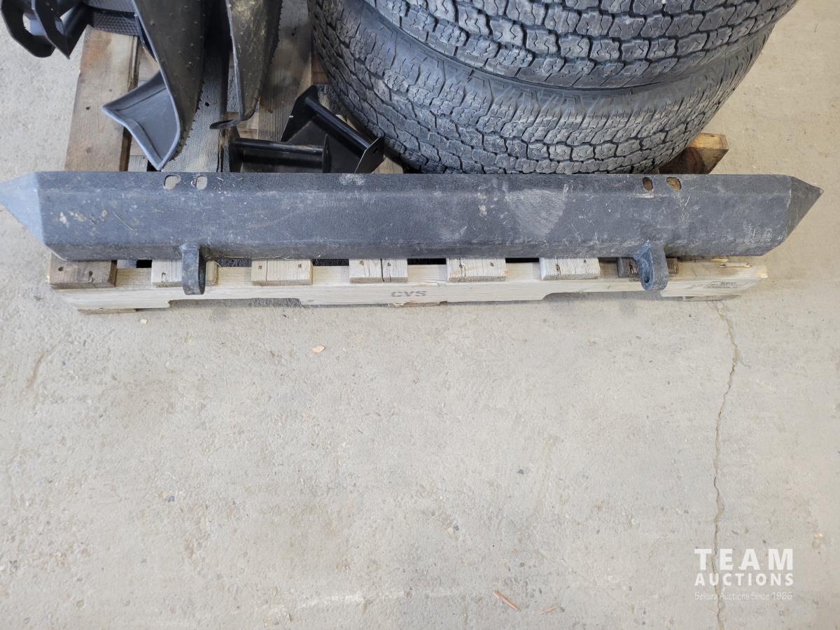 (2) Goodyear Wranglers 275/55R20 all terrain tires, (2) Husky liner floormats, (4) Bully Truck side steps, (2) Erickson wall mountable tie down anchors, bumper 54 inch x 4 inch, (2) jugs of farm oil and heavy duty antifreeze