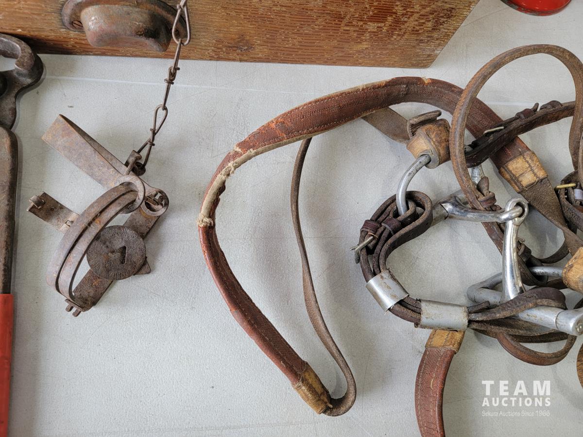 Wood box with horse bridle, horse shoes, horse brush, horse clipper, critter trap, red lantern and kerosene lamp