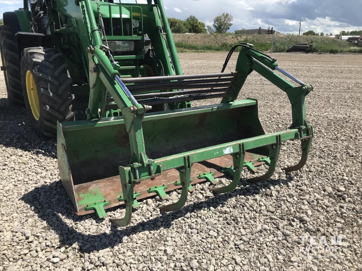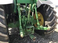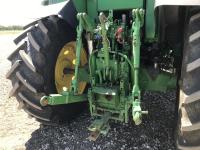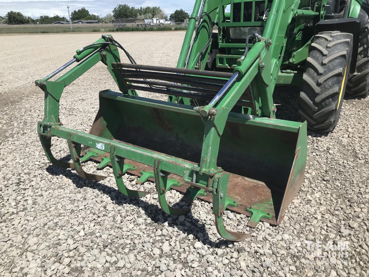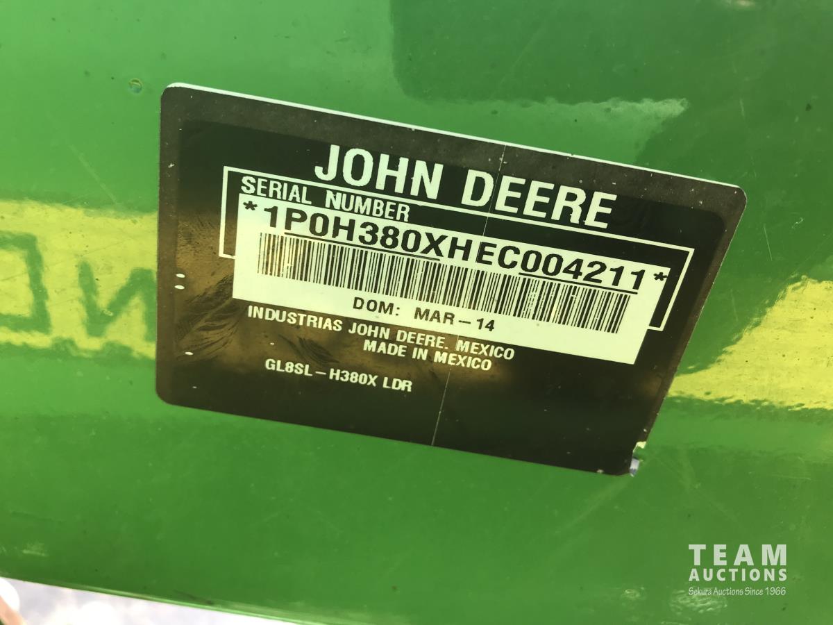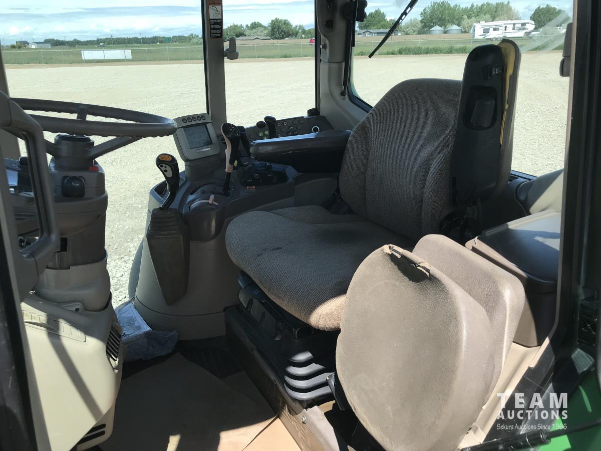 John Deere H380X loader, 96 inch bucket, grapple, John Deere 6.8 6 cylinder 166 HP, diesel engine, 140 PTO HP, 20 speed partial power shift transmission, 29 GPM hydraulic pump, cab, left hand reverser, A/C, radio, air ride seat, buddy seat, Big 1000 PTO, 3 point hitch, 3 rear hydraulic outlets, 420/85R28 front tires, 520/85R38 rear tires