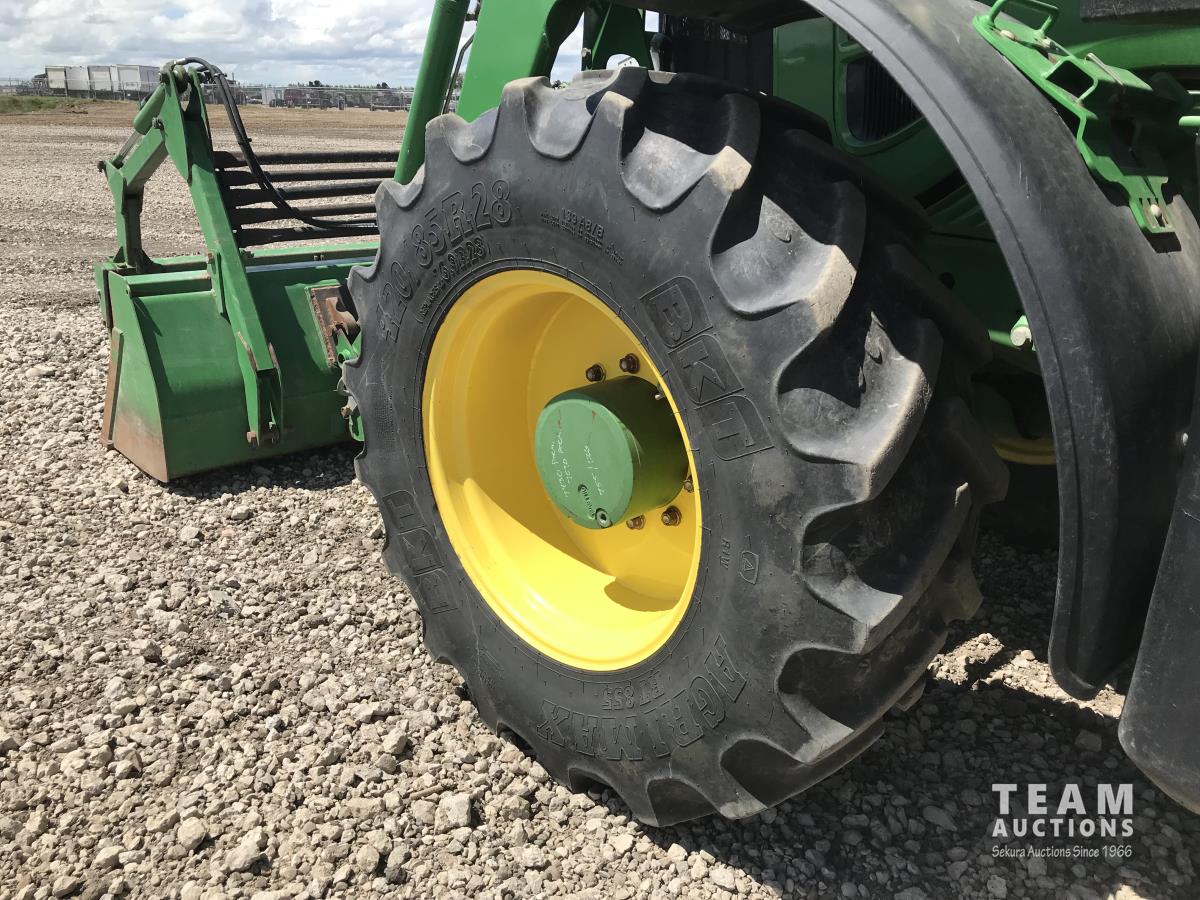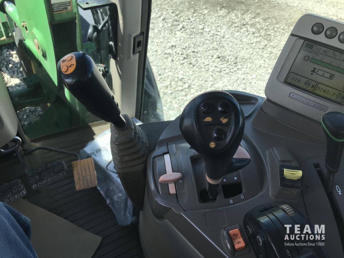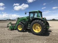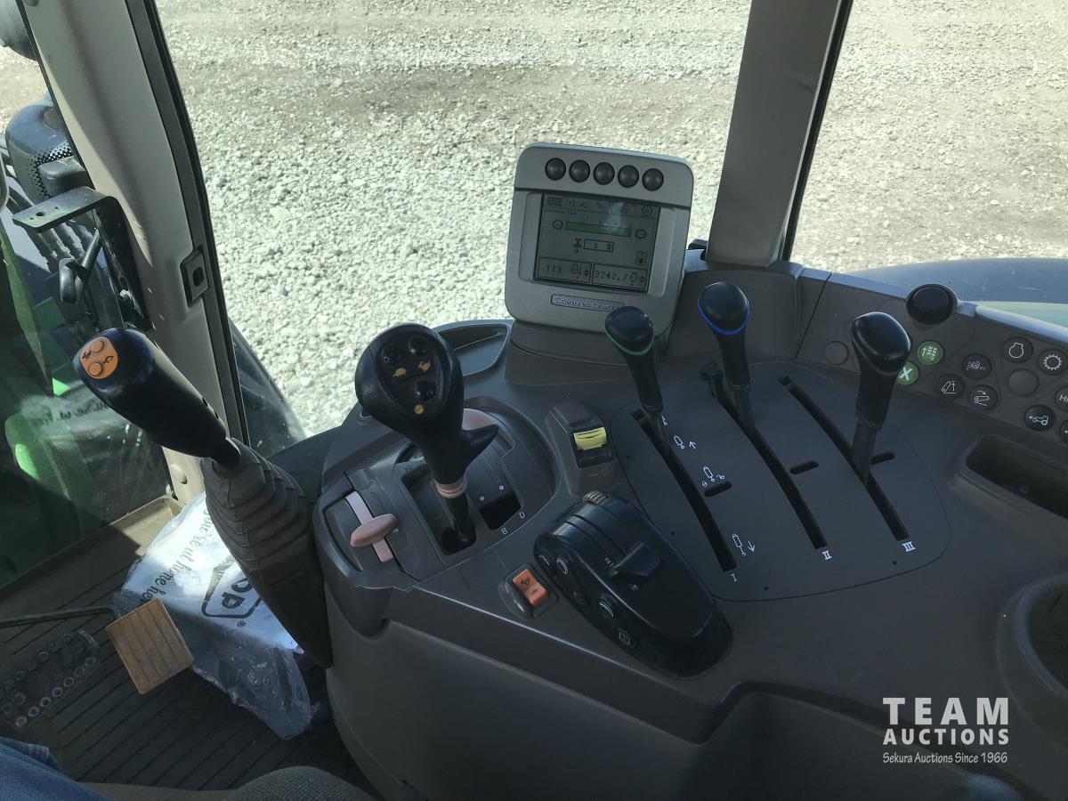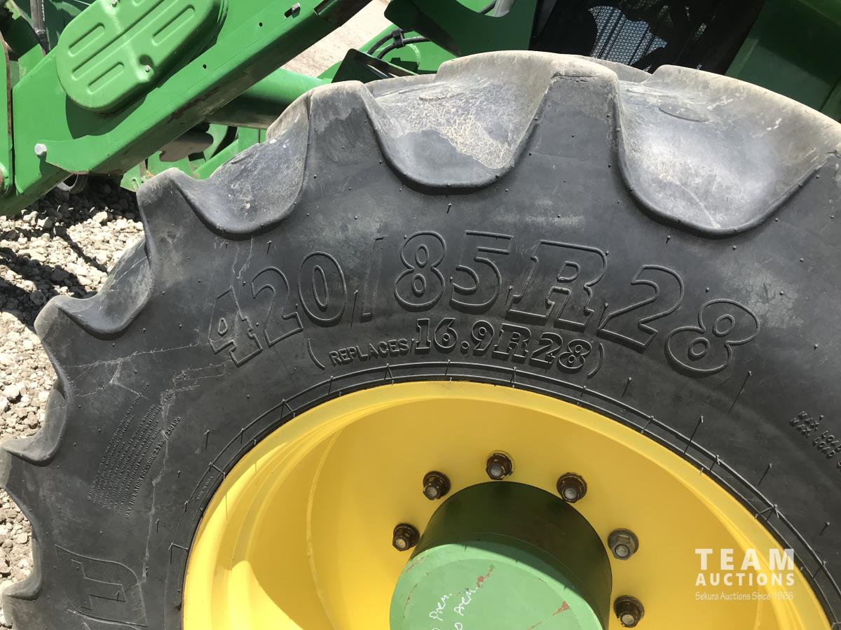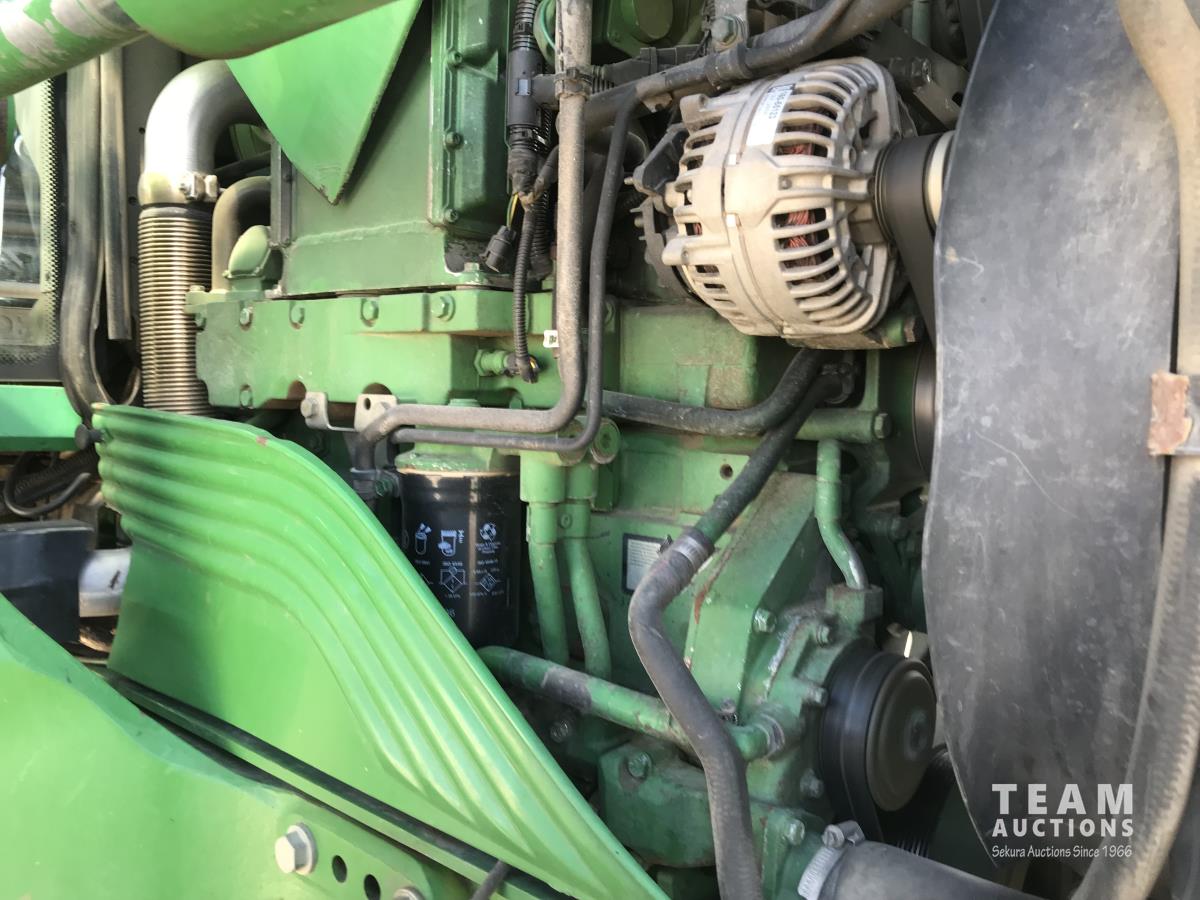 John Deere H380X loader, 96 inch bucket, grapple, John Deere 6.8 6 cylinder 166 HP, diesel engine, 140 PTO HP, 20 speed partial power shift transmission, 29 GPM hydraulic pump, cab, left hand reverser, A/C, radio, air ride seat, buddy seat, Big 1000 PTO, 3 point hitch, 3 rear hydraulic outlets, 420/85R28 front tires, 520/85R38 rear tires