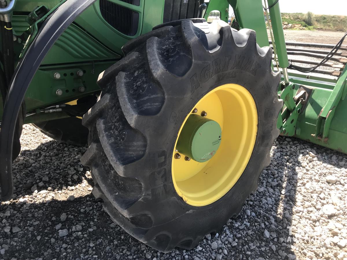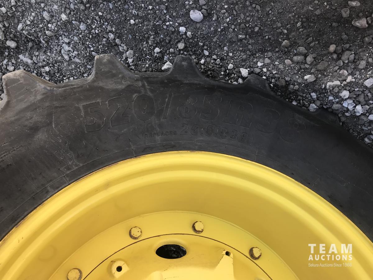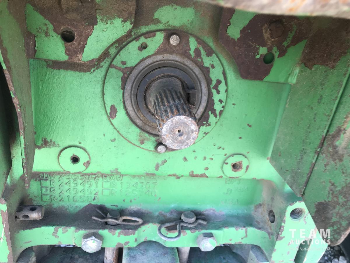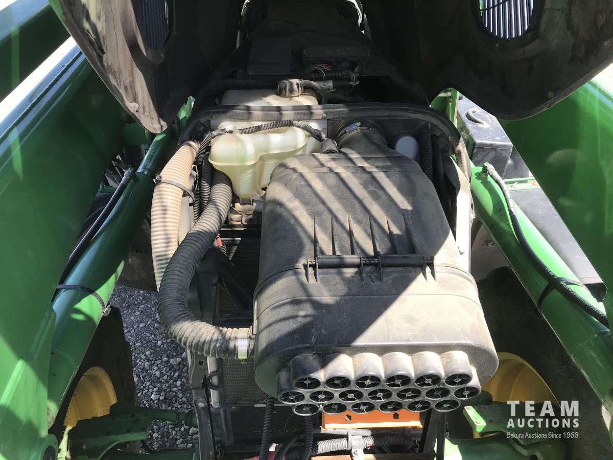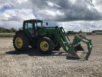 John Deere H380X loader, 96 inch bucket, grapple, John Deere 6.8 6 cylinder 166 HP, diesel engine, 140 PTO HP, 20 speed partial power shift transmission, 29 GPM hydraulic pump, cab, left hand reverser, A/C, radio, air ride seat, buddy seat, Big 1000 PTO, 3 point hitch, 3 rear hydraulic outlets, 420/85R28 front tires, 520/85R38 rear tires