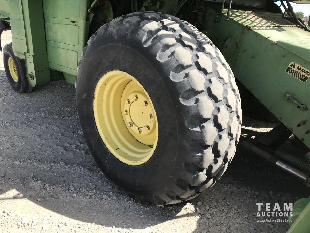 John Deere pick-up header, variable speed reel, rock trap, chaff spreader, 23.1-26 front tires, 11.00-16 rear tires