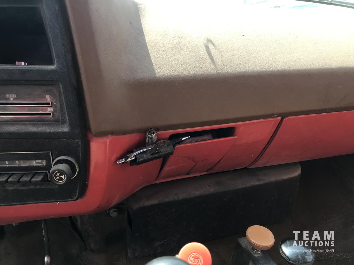 V8 gas engine, 5 speed manual transmission, 2 speed axle, 14 ft box, hoist, roll tarp, spring suspension, 10.00R20 tires