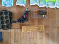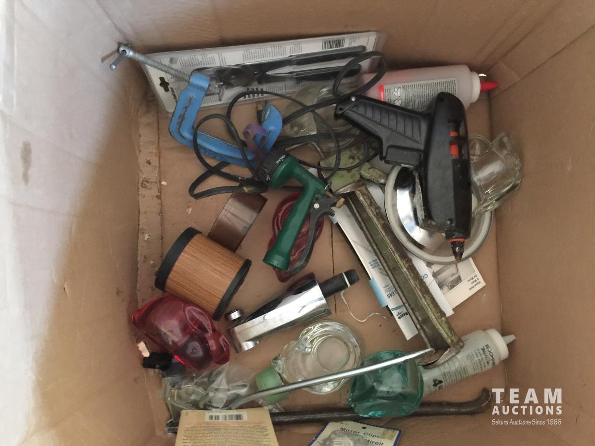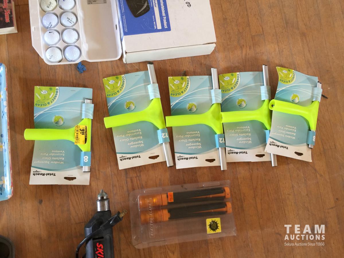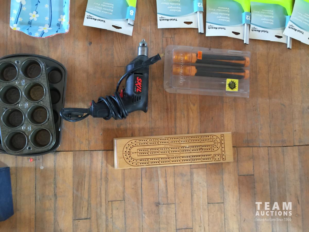 Christmas Lights, Cooking Books, Clock, Golf Balls, (3) 12in Window Squeegee, (2) 8in Window Squeegee, Skil Power Drill, Cupcake Trays, Crib Board, Cutting Board, (2) Tool Trays, Hot Glue Gun, G Clamp, Silicone Gun