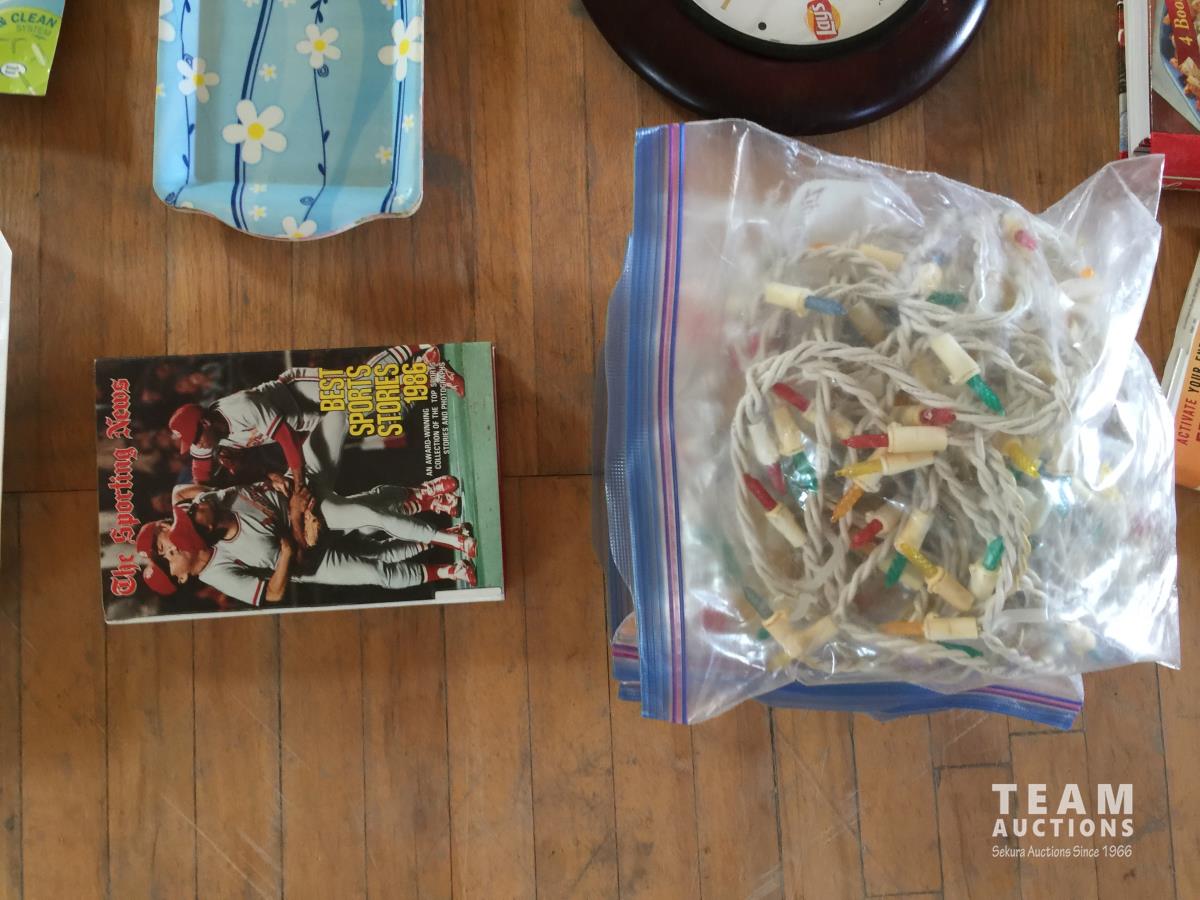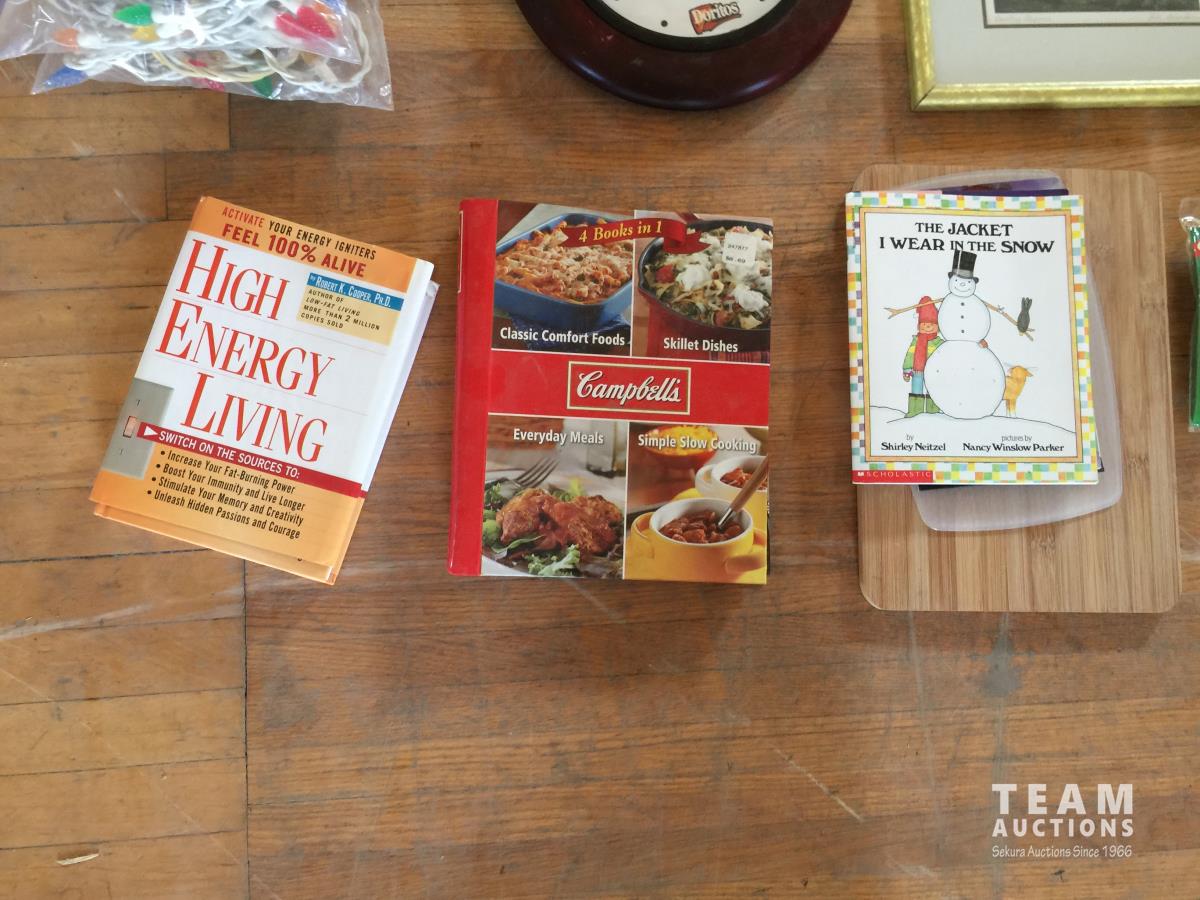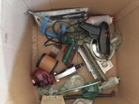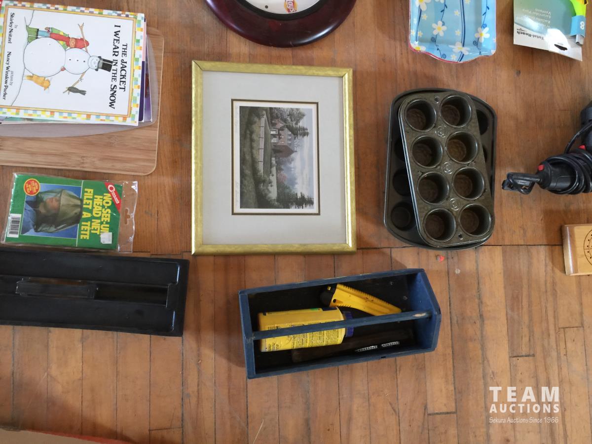 Christmas Lights, Cooking Books, Clock, Golf Balls, (3) 12in Window Squeegee, (2) 8in Window Squeegee, Skil Power Drill, Cupcake Trays, Crib Board, Cutting Board, (2) Tool Trays, Hot Glue Gun, G Clamp, Silicone Gun