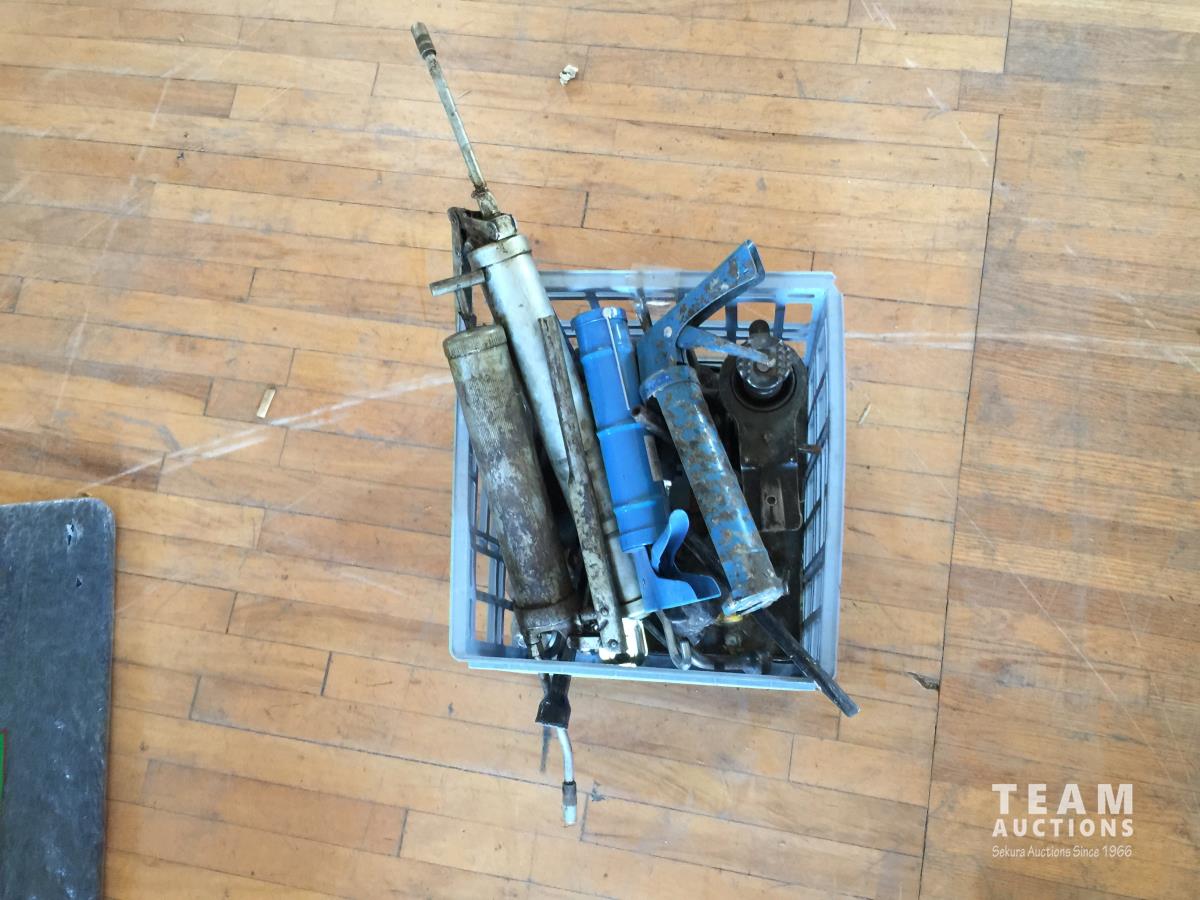 (2) Grease Guns, (2) Tow Hitches, (2) Caulking Guns, (3) Wheel Braces, (1) Jack