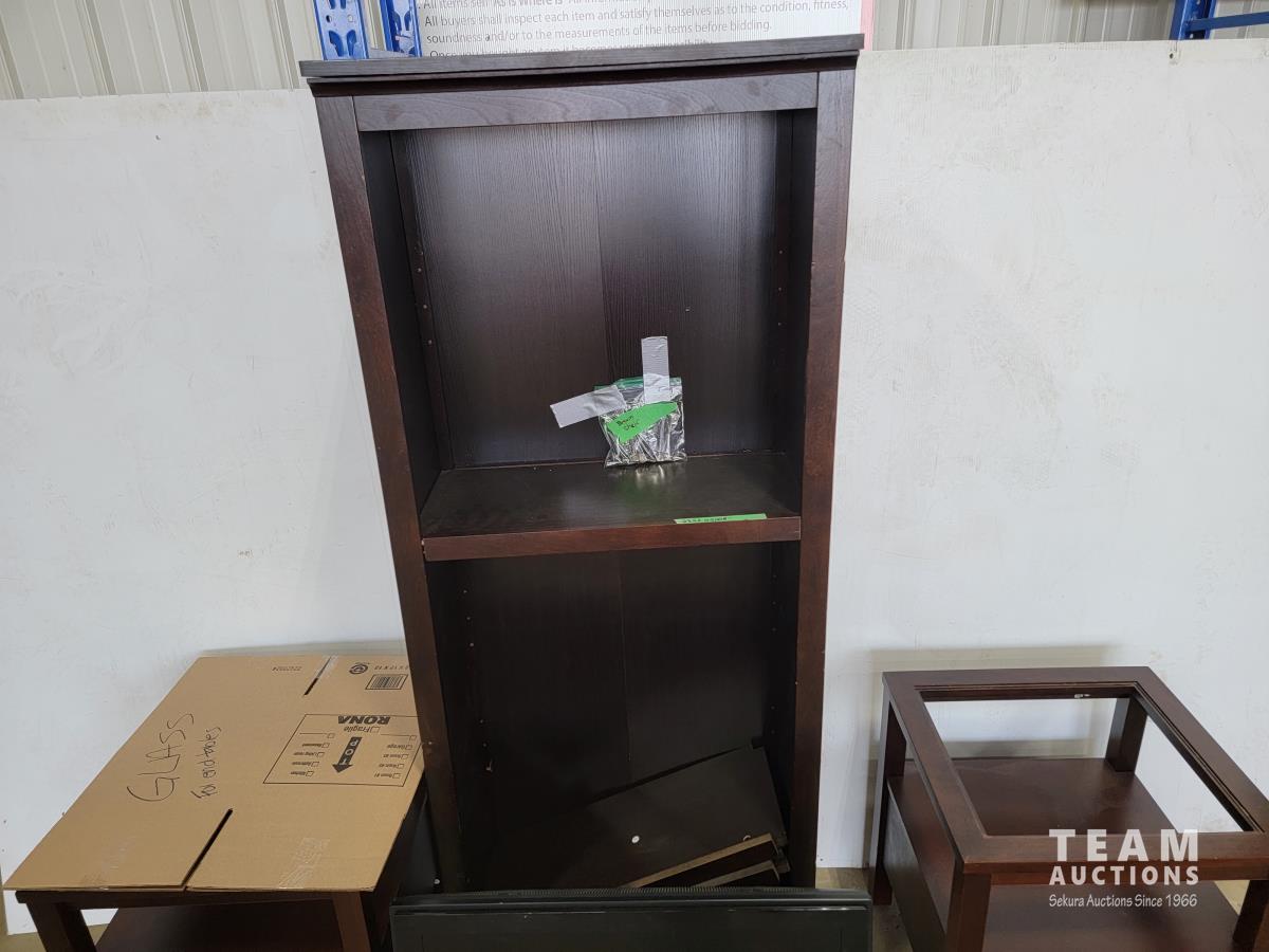 End tables: 21-3/4 inch l x 19-3/4 inch d x 24-1/2 inch h Shelf: 28-1/4 inch l x 12-1/4 inch d x 72 inch h