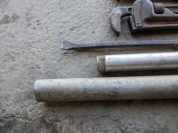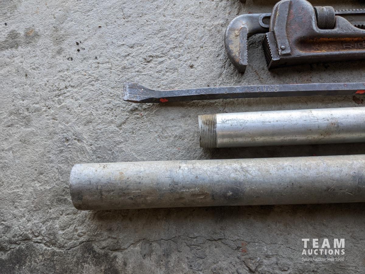 1145 (3) 24 Inch Pipe Wrenches, Brico Pry Bar and (2) Aluminum Pipes