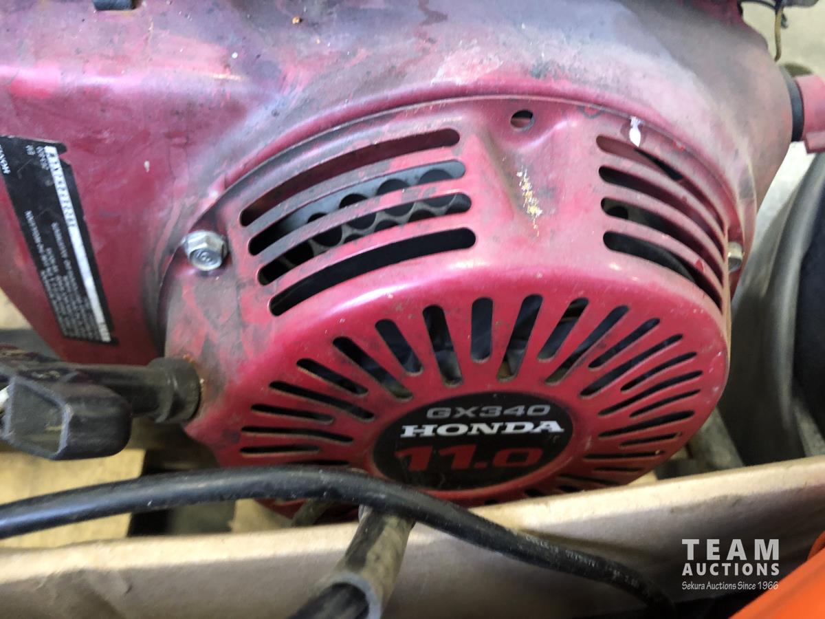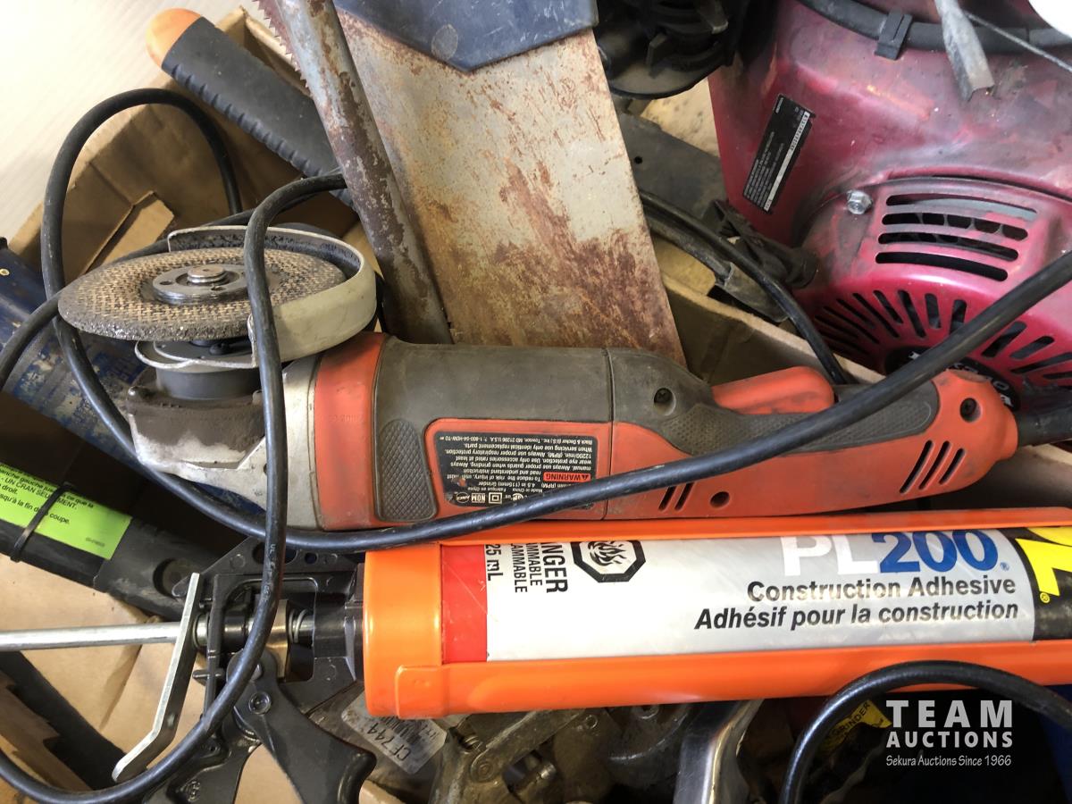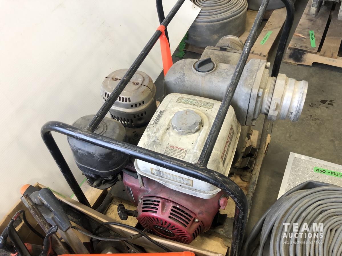 Trash pump has 11 HP Honda GX340 engine, assorted tools, grease guns, caulking gun, angle grinders
