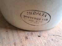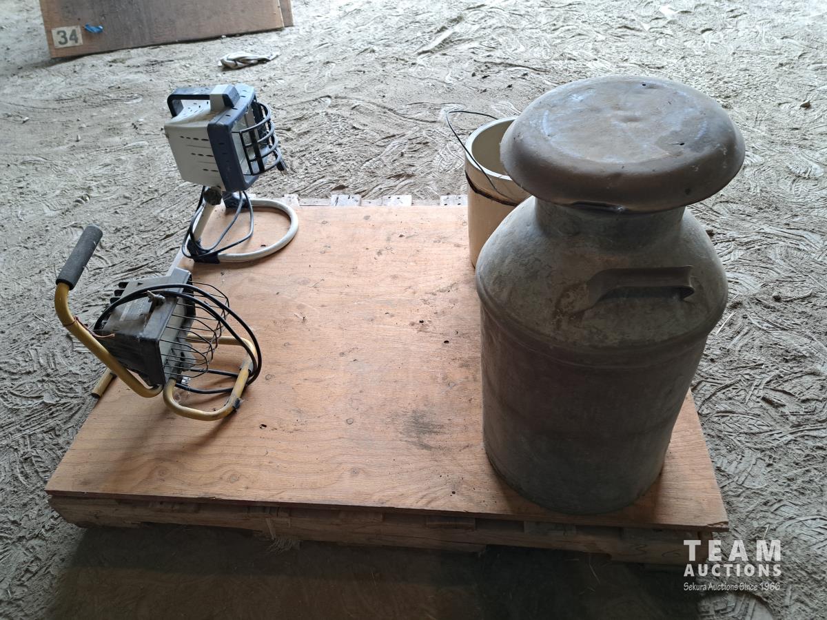 2 halogen work lights, 1 ceramic pottery container with handle