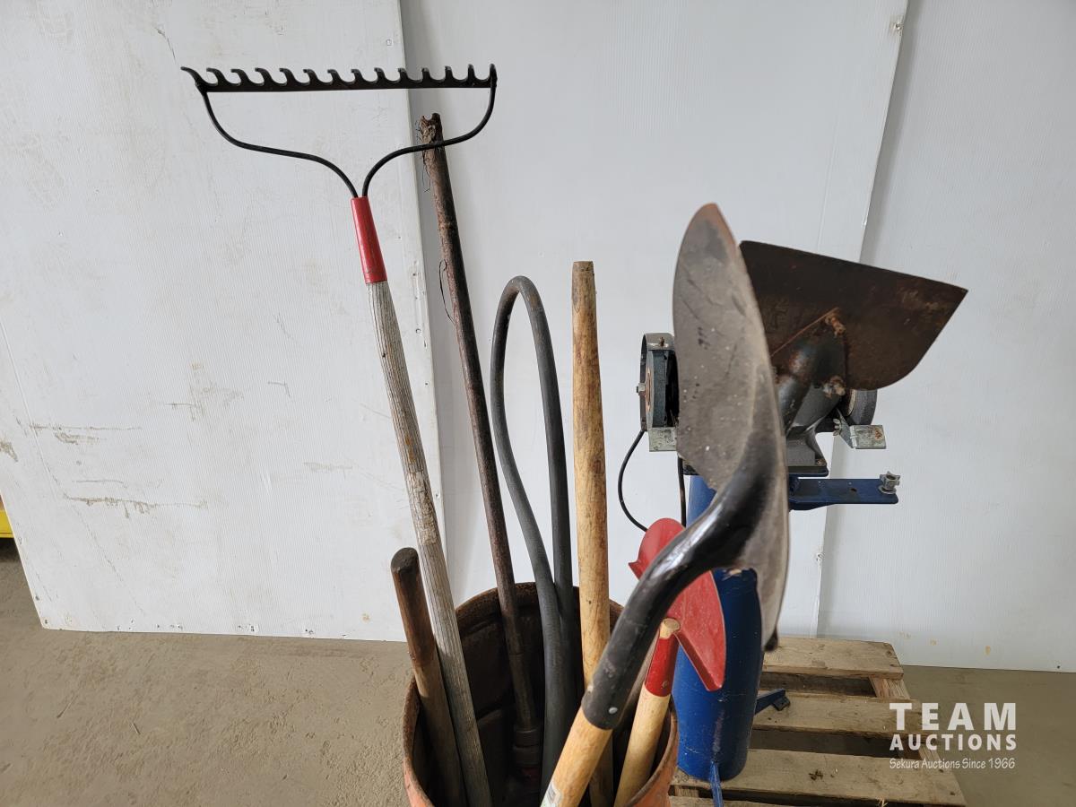 1413 Hammer, Barrel Pump, Shovel, Rake, Bench Grinder On Stand
