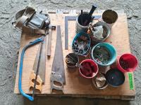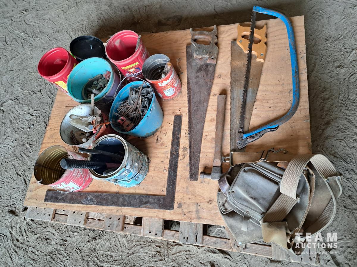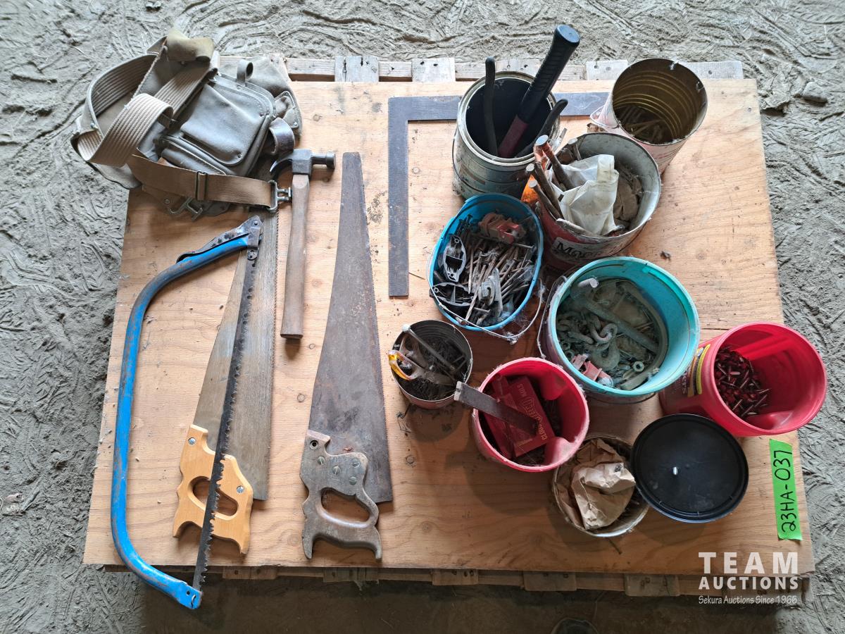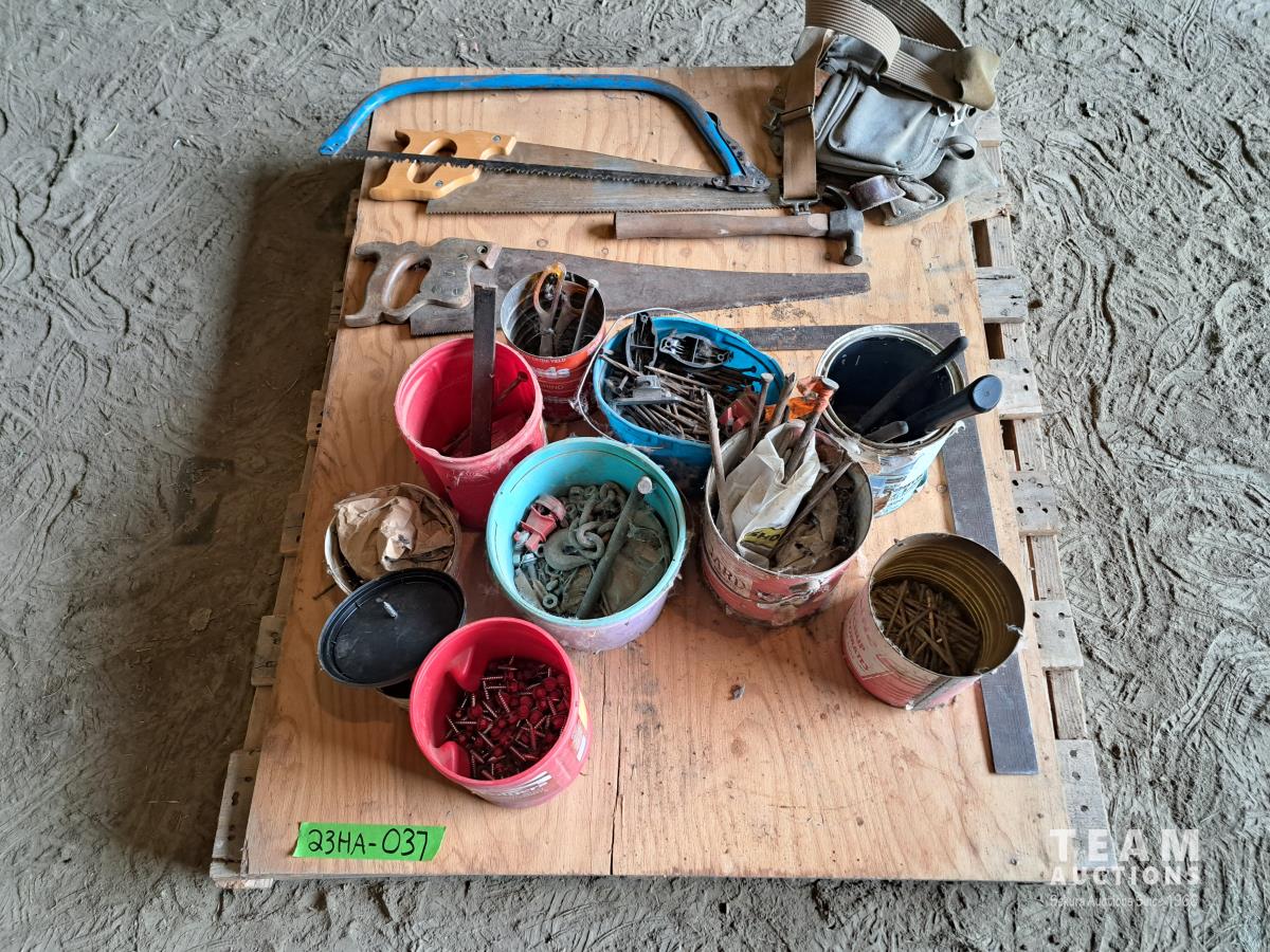 Pallet of assorted hardware fasteners, hand tools, carpenter belt
