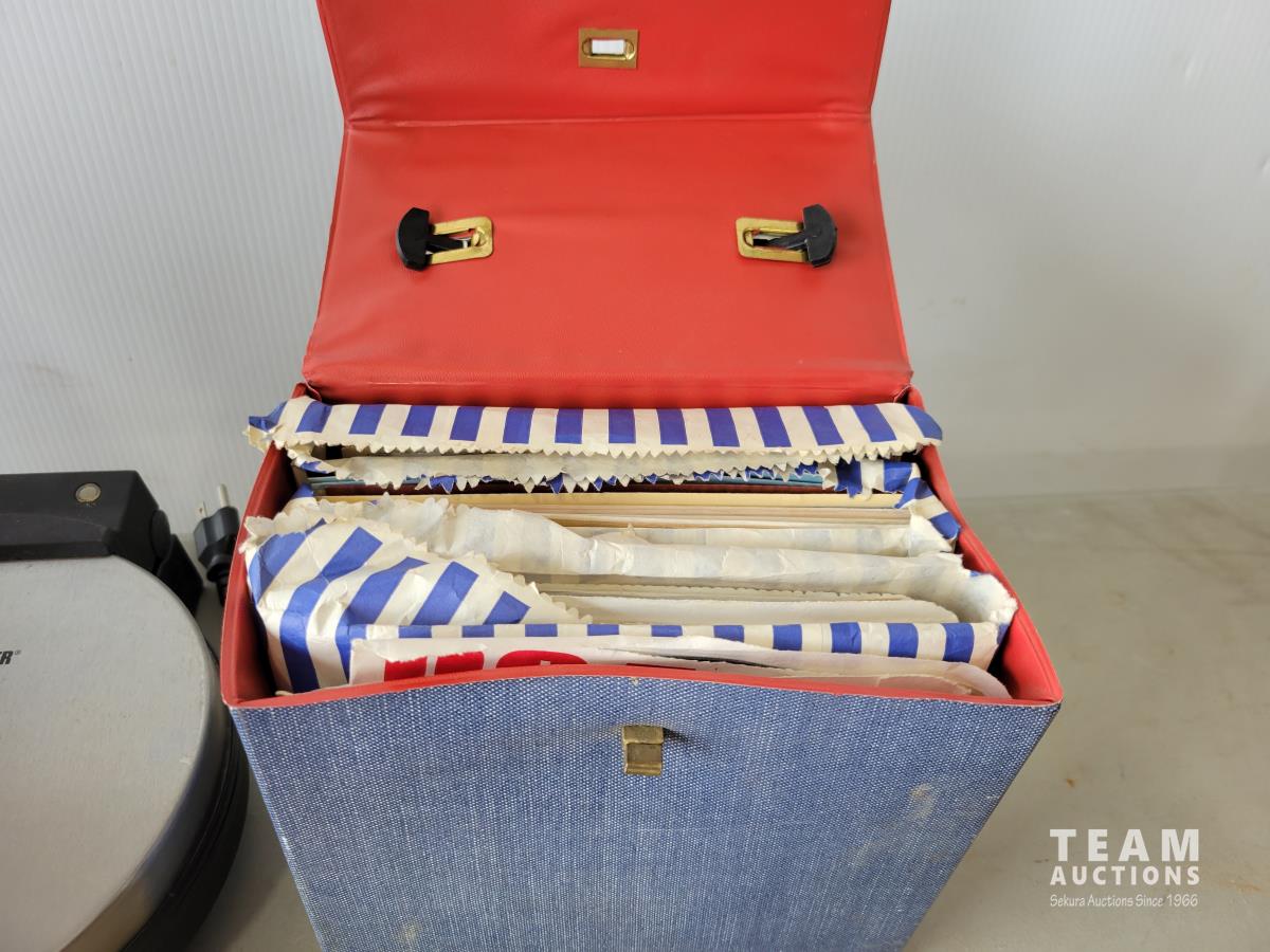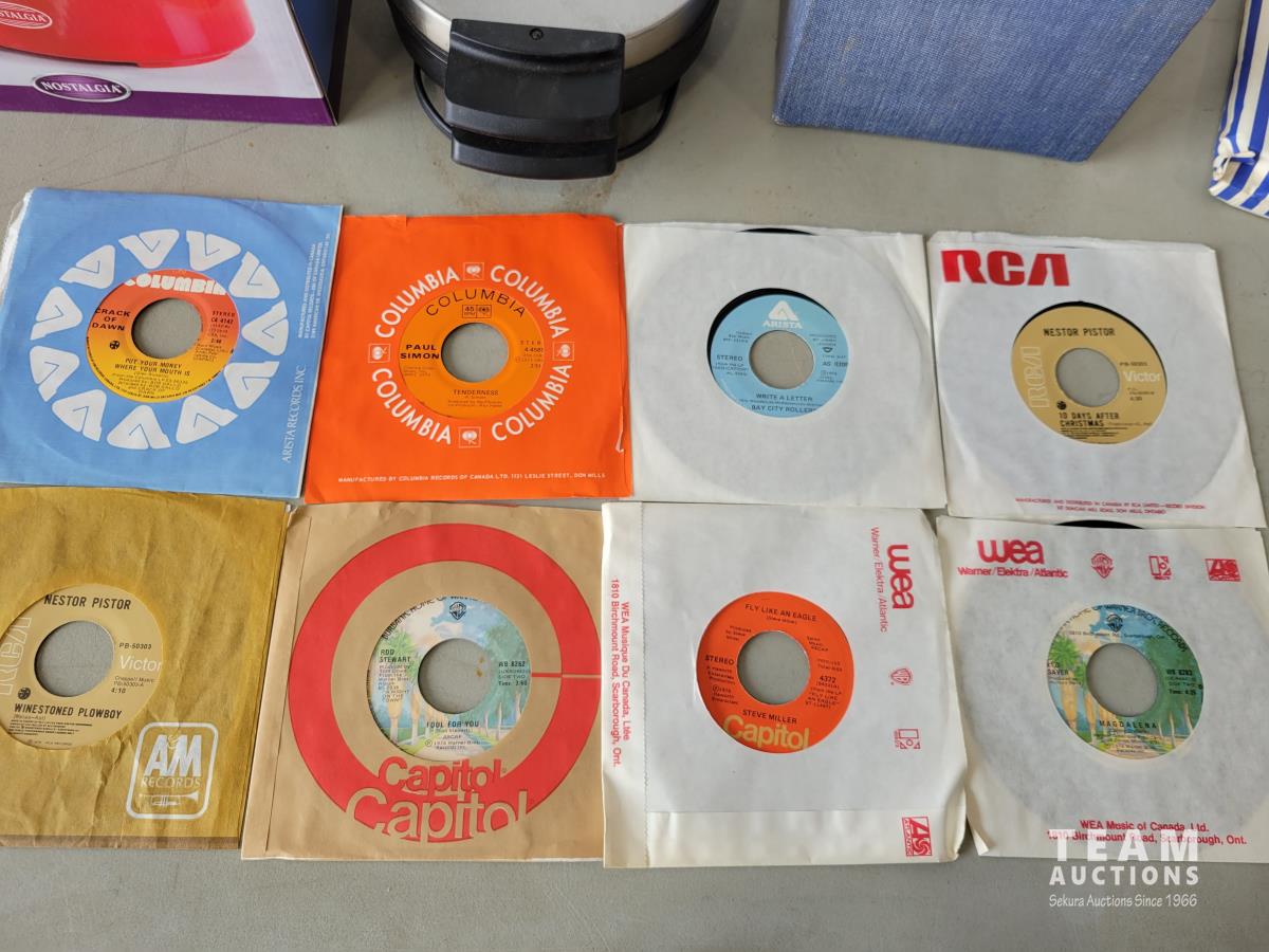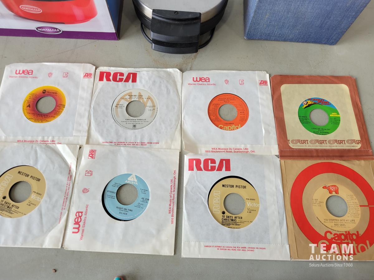 1982 Nostalgia Popcorn Maker, B&D Waffle Iron and Qty of 45 Records