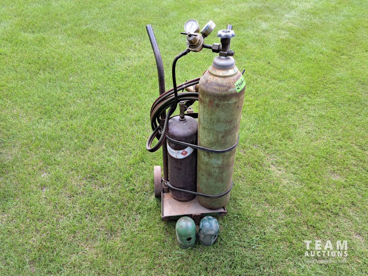 Wheeled cart, cutting torch, hoses and gauge assembly.